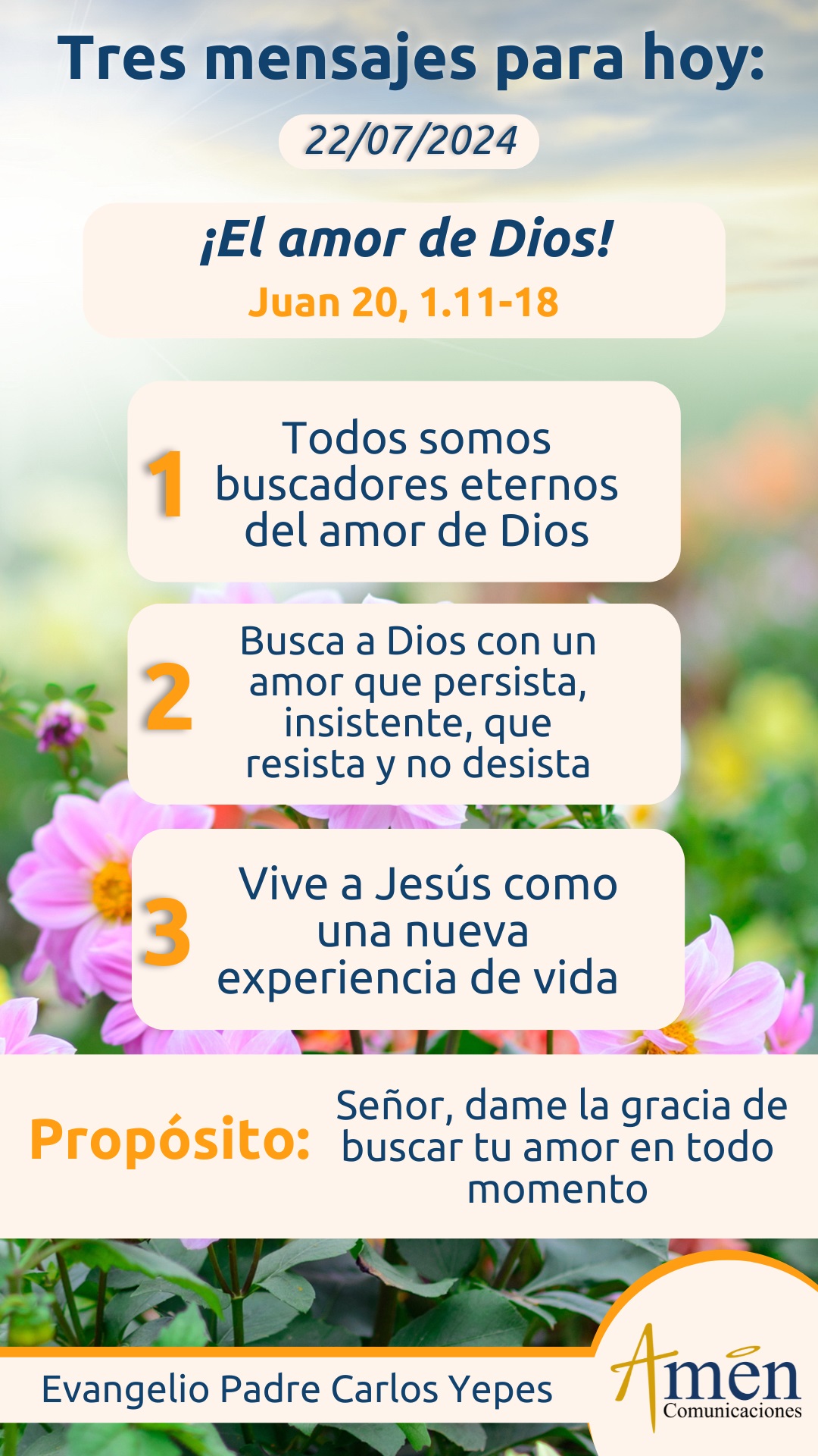 Hoy te invito para que por la fuerza del amor perseveres, insistas, persistas, resistas y nunca desistas de buscar el rostro de Dios. Hay tantas búsquedas en el mundo: la salud, un buen cuerpo, un mejor lugar para vivir, una mejor casa, una jubilación terrenal, una pensión, un seguro que podamos comprar o que podamos cobrar; pero hay algo más profundo y es por el amor, buscar a quien nos da la esencia, la fuerza y el norte en la vida. Aprendamos de Magdalena a buscar amando, y amando alcanzando la meta de Dios revelado en Jesucristo.