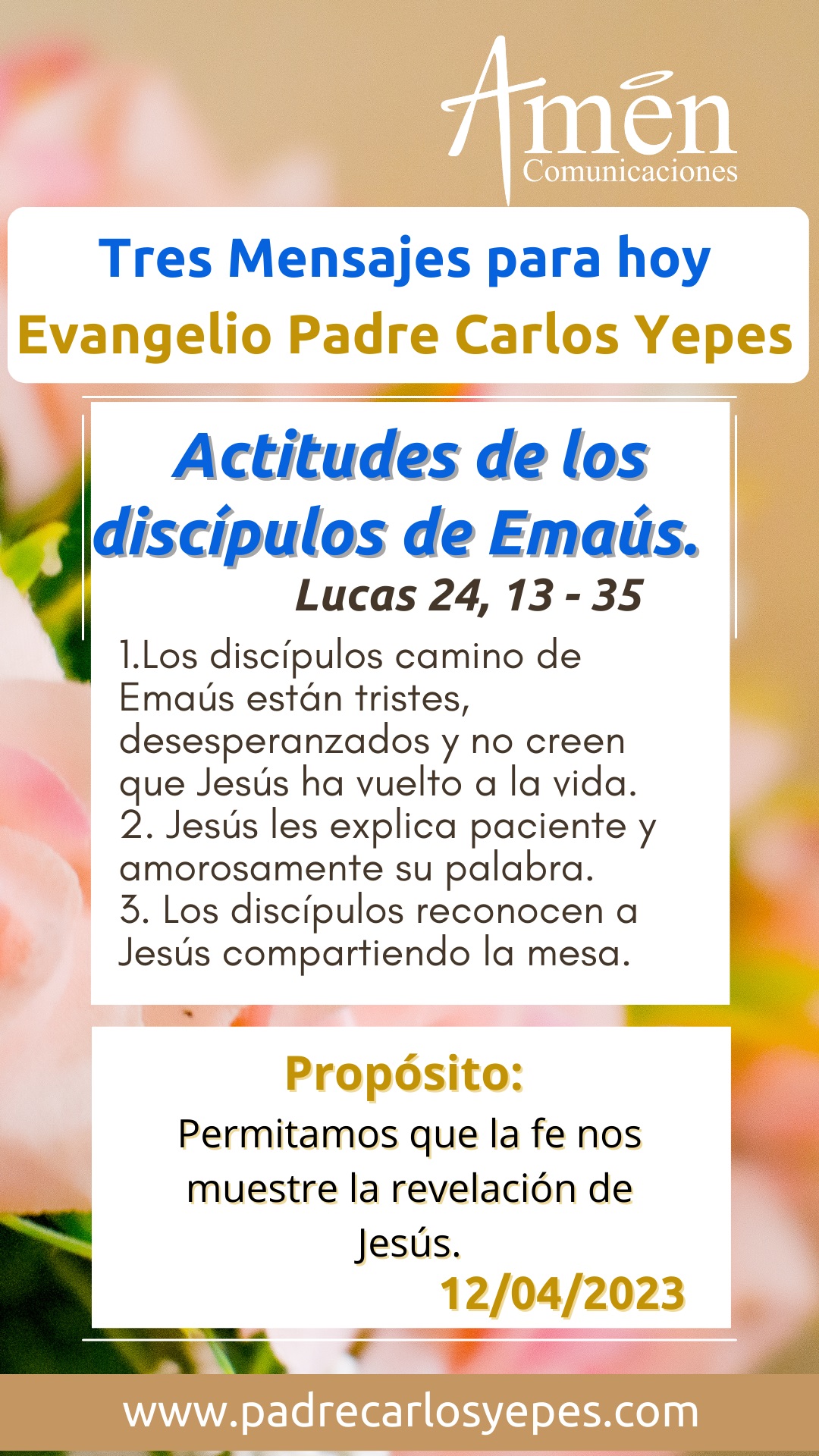 Hoy Señor te damos gracias por esta catequesis sobre los discípulos de Emaús y te decimos con ellos ¡quédate con nosotros, cae la tarde en nuestras vidas, necesitamos tu presencia uno, tu palabra que anima y estimula y hace arder el corazón dos y sobre todo tu pan de vida, la Eucaristía, que nos hace sentir que vives en medio de nosotros!