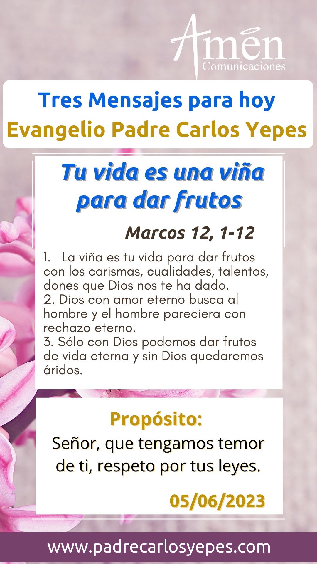 Señor: “Ojalá escuchemos hoy tu voz, no endurezcamos nuestro corazón”. Señor, que tengamos temor de ti, respeto por tus leyes y que no vivamos como el hombre, la mujer, la generación de hoy con tanta rebeldía frente a Dios, con tanta soberbia en su corazón, con tanta negación de aquel que por amor nos ha creado y nos ha dado la viña, la propia vida, para dar frutos con ella.