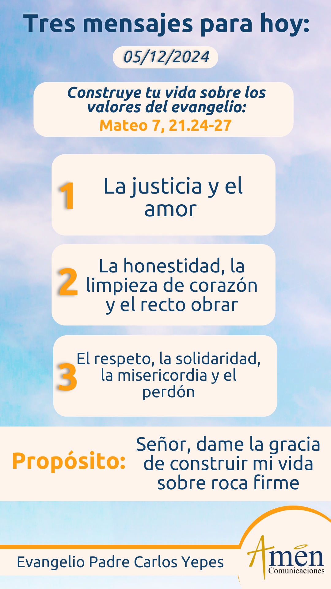 Hoy te pregunto: ¿has construido tu vida sobre los valores del evangelio que Jesús nos propone, esto es la justicia, el amor, la honestidad, la limpieza de corazón, el recto obrar, el respeto, la solidaridad, la misericordia, el perdón al que me ofende?, si has construido tu vida sobre estos valores profundamente cristianos, profundamente evangélicos y siempre eternos y firmes, aunque vengan en tu vida dificultades, esos valores de justicia, honestidad, confianza en Dios, esperanza en el Altísimo, fe profunda, amor, perdón, ayudaran a superar cualquier viento huracanado, cualquier prueba que tengas en la vida. Por el contrario, si has construido tu vida, tu familia, tu trabajo sobre arena que es deleznable, vives de apariencias, vives de vanidades humanas, vives de las trampas de los caminos cortos o atajos en el trabajo, en el estudio, con los amigos; vives en medio de rivalidades, competencias, envidias, manejas egoísmos en tu corazón, te mueves a actuar por resentimiento, por ambición, por orgullo, ten la seguridad que has construido tu vida sobre arena y cuando vengan pruebas, sufrimientos, dificultades, vientos huracanados en tu alma, probablemente sucumbirás.