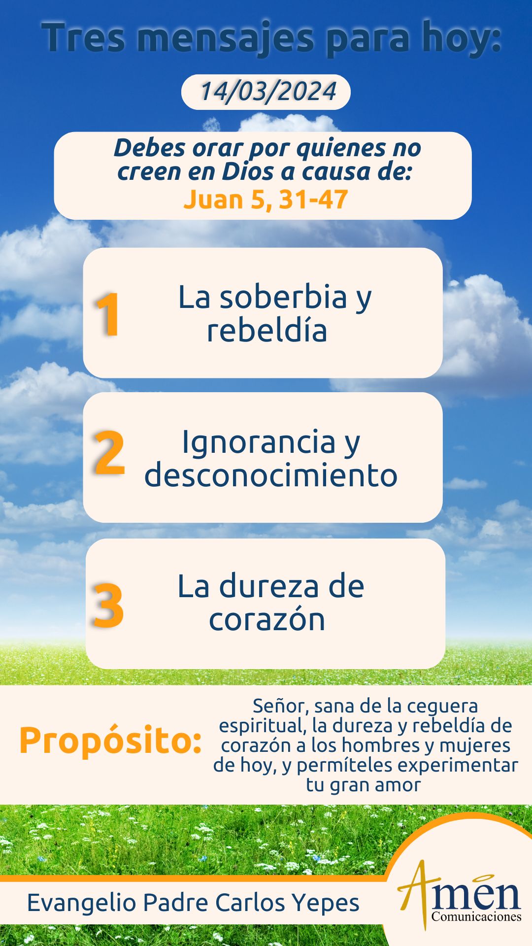 Me impresiona profundamente esta afirmación del capítulo 5 de san Juan, porque hoy con toda seguridad, detrás de personas que se les volvió vicio, moda, criticar la Iglesia, el cristianismo, la fe religiosa, y se sienten modernas, progresistas, muy fashion, muy de moda, muy de los tiempos actuales, mostrando desprecio por lo religioso; podríamos decir de estas personas como lo dijo Jesús: “Les conozco su corazón y sé que no han conocido el amor de Dios, que el amor de Dios no está en ustedes, porque el Padre de los cielos, a través de Jesús y de sus enviados ha venido, pero no lo han recibido”.
