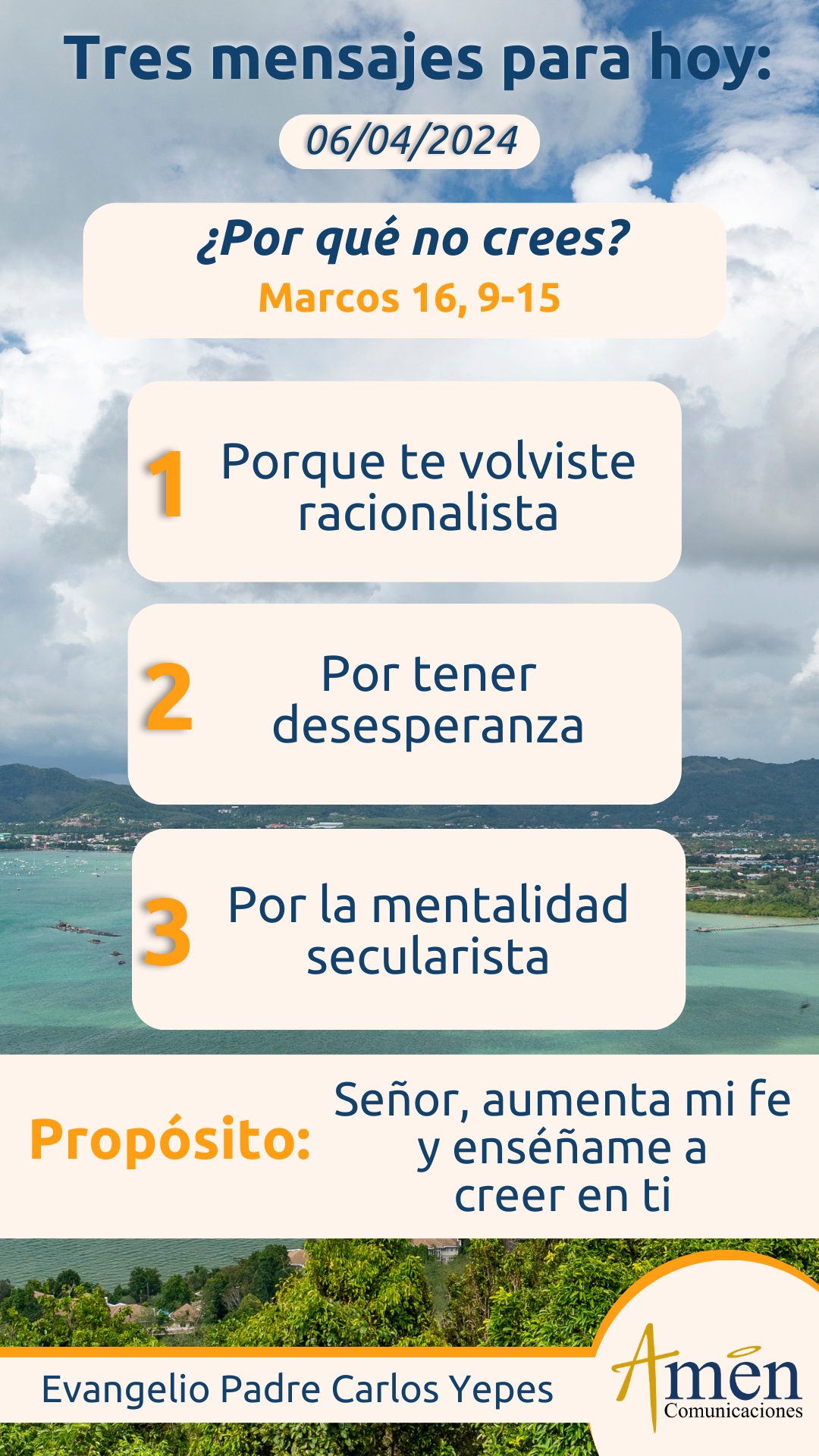 Hoy, que ese reproche de Jesús no se dirija a nuestra vida, que no sintamos en el corazón que Él nos dice, por tu falta de fe, por tu racionalismo, por tu experiencia solo con la muerte, por no abrirte a una dimensión religiosa, porque tienes una mentalidad muy secularista; tal vez no eres capaz de descubrir, que estás llamado a grandes tareas, a una dimensión más profunda de la vida, a un nuevo y más alto horizonte existencial. Que el Señor hoy no nos reprenda, no nos regañe por nuestra terquedad y ceguera espiritual.