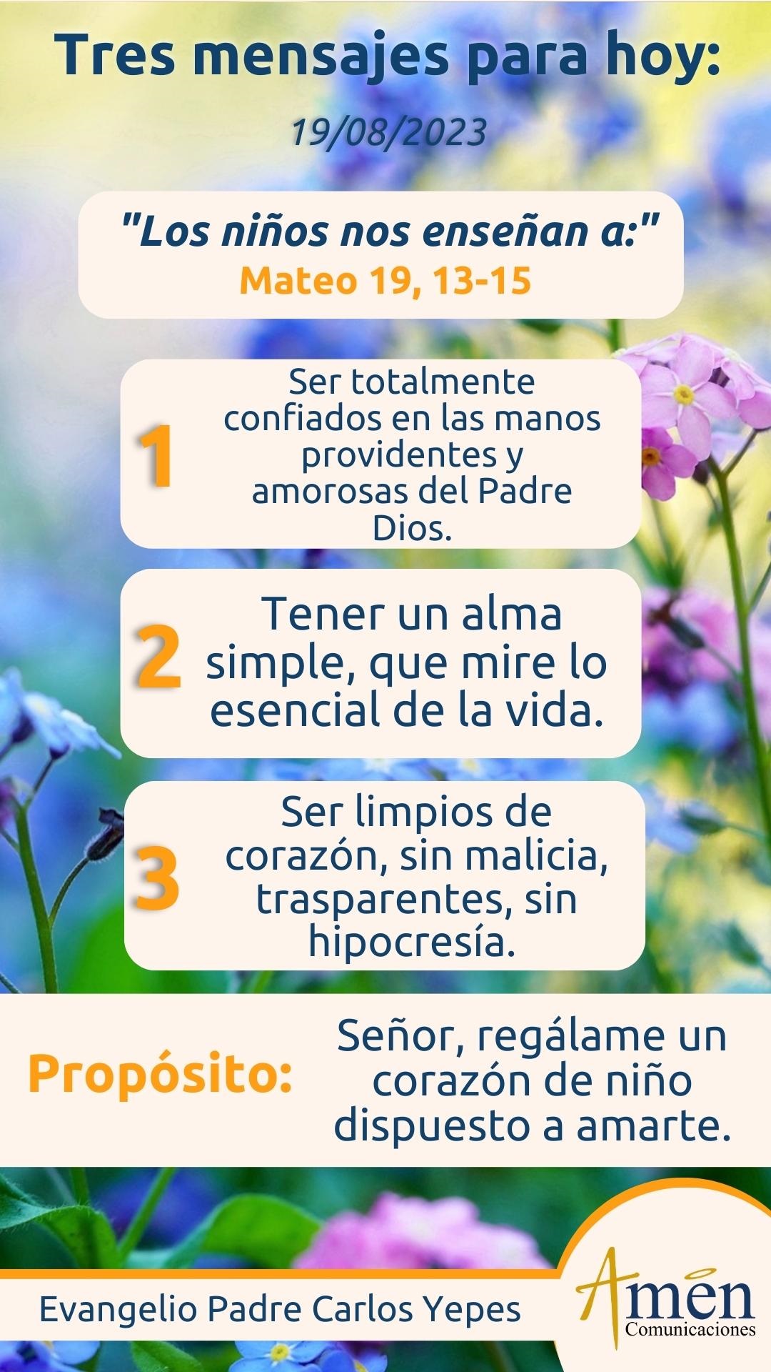 Primera, el niño es por excelencia un alma, un corazón confiado, cree en los adultos, confía en sus palabras; y así se nos invita a nosotros con alma de niños, a ser totalmente confiados en las manos providentes y amorosas del Padre Dios. Hoy tenemos una crisis de confianza, no solamente en las instituciones políticas, económicas, militares, sociales y aun en las instituciones religiosas; sino que también hay una crisis de confianza en las relaciones interpersonales. Aprendamos de los niños a ser confiados y sobre todo confiados en Dios, de quien nos viene toda dádiva, toda bendición.