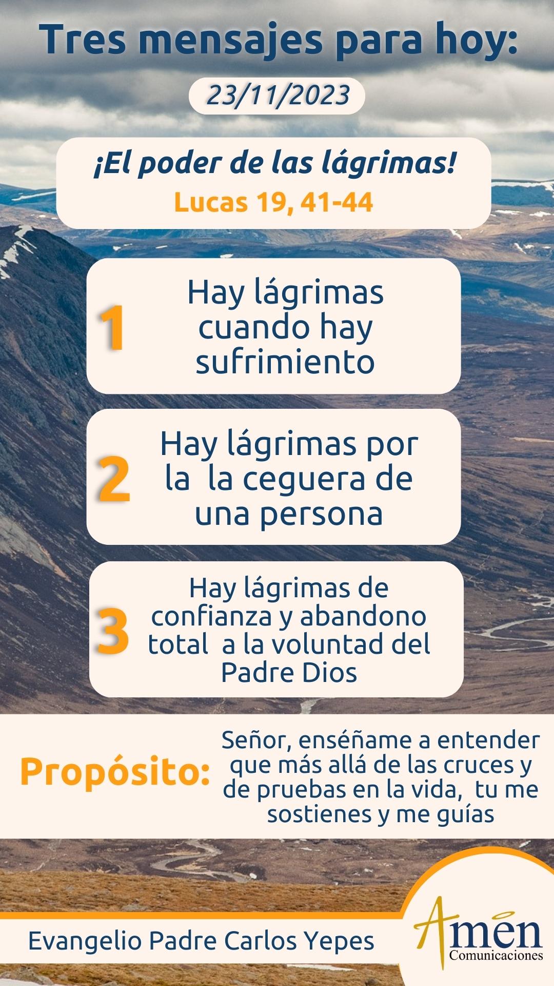 Hoy te invito, para que no llores demasiado por haber perdido los deleites de este mundo que pasan, a que no llores demasiado, por la impenitencia de un ser querido que está encerrado en su pecado, en su esclavitud personal. Te invito, a que llores más bien por ti, cuando suceden esas muertes afectivas, muertes emocionales, muertes económicas, muertes espirituales, sin una perspectiva de resurrección. Lloremos fundamentalmente, porque nuestras lágrimas son de confianza, de abandono total en la voluntad de Dios, sabiendo que más allá de cruces y de pruebas en la vida, nuestra existencia la sostiene y la guía. Dios.