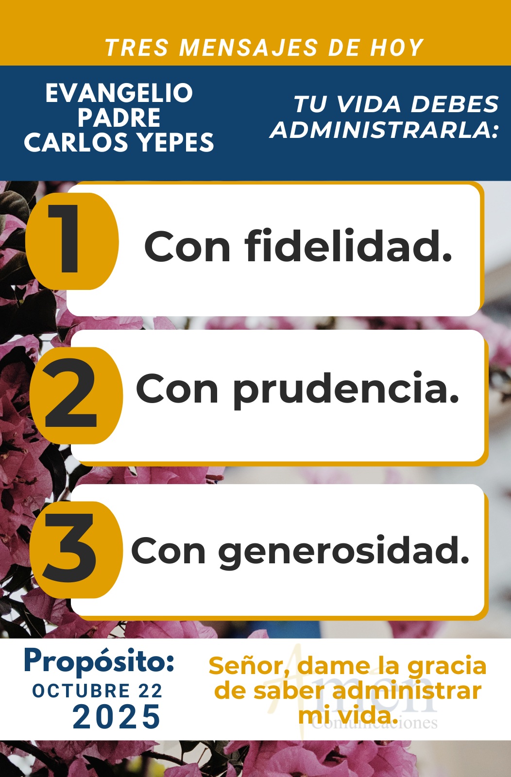 Que no llegues a los 50 años, 60 años diciendo ¿qué he hecho con mi vida?, cómo acabé con mi familia, cómo no respondí por tantos carismas y talentos, dones especialísimos que he recibido. Cómo malgasté los años de mi juventud, cómo no cuidé mi salud, cómo perdí tiempo tristemente, cómo no busqué en una edad más temprana a Dios. Son reflexiones que uno como sacerdote escucha con alguna frecuencia en las personas, y hoy te invito a que seas un administrador fiel y prudente sobre tu vida. Todos, tú y yo vamos a morir. Todos tú y yo estamos en la fila, no sabemos cuándo, pero estamos en la fila. Y ese día de nuestra muerte, el Señor nos pedirá cuentas de cómo hemos administrado nuestra vida. Y valdrá, valdrá la reflexión de san Pablo en la primera lectura: “Que el pecado y las pasiones desordenadas del pecado no esclavicen nuestra vida, no nos hagan perder los años preciosos de juventud. Y no digamos, malgasté tristemente mi existencia”.