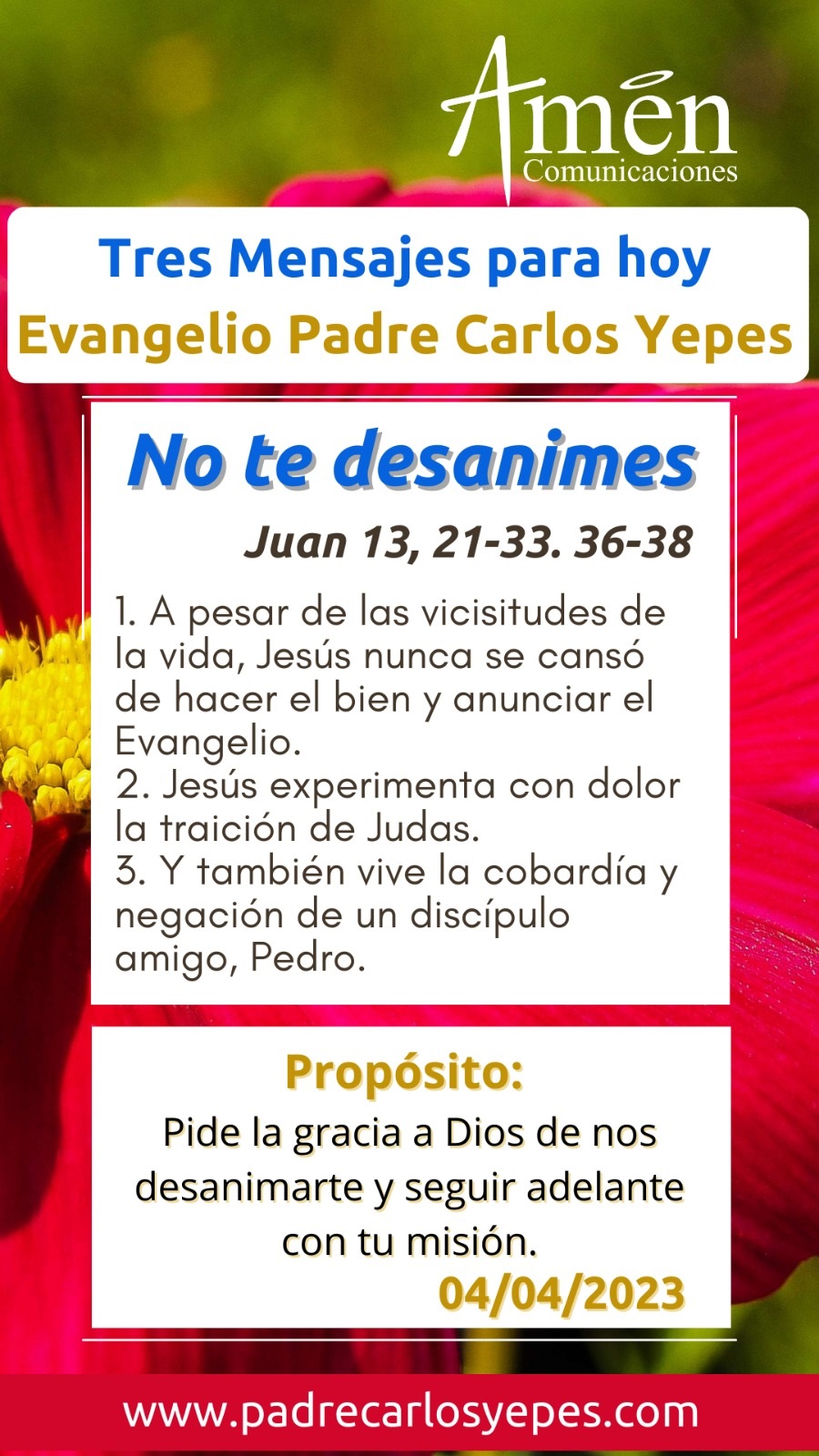 Hoy en este evangelio, constatamos dos grandes punzadas en el corazón de Jesús, la traición de un discípulo y la cobardía y negación de un discípulo amigo, por eso, cuando sientas en tu vida que en la mala hora algunos te han abandonado, te han negado, o peor aún te han traicionado, piensa que este es el camino de la Pasión, que todo seguidor de Jesús debe cumplir, piensa que no podemos correr una suerte distinta de la del Maestro y que si Él fue traicionado y negado en el momento de la mala hora de la noche, de la oscuridad, ¿por qué a nosotros sus discípulos 2000 años después, no nos puede pasar? Esta es la fe cristiana y este es el drama humano divino que nos muestra, que nuestra total confianza, no es en los hombres, sino solamente y nada más que en Dios.