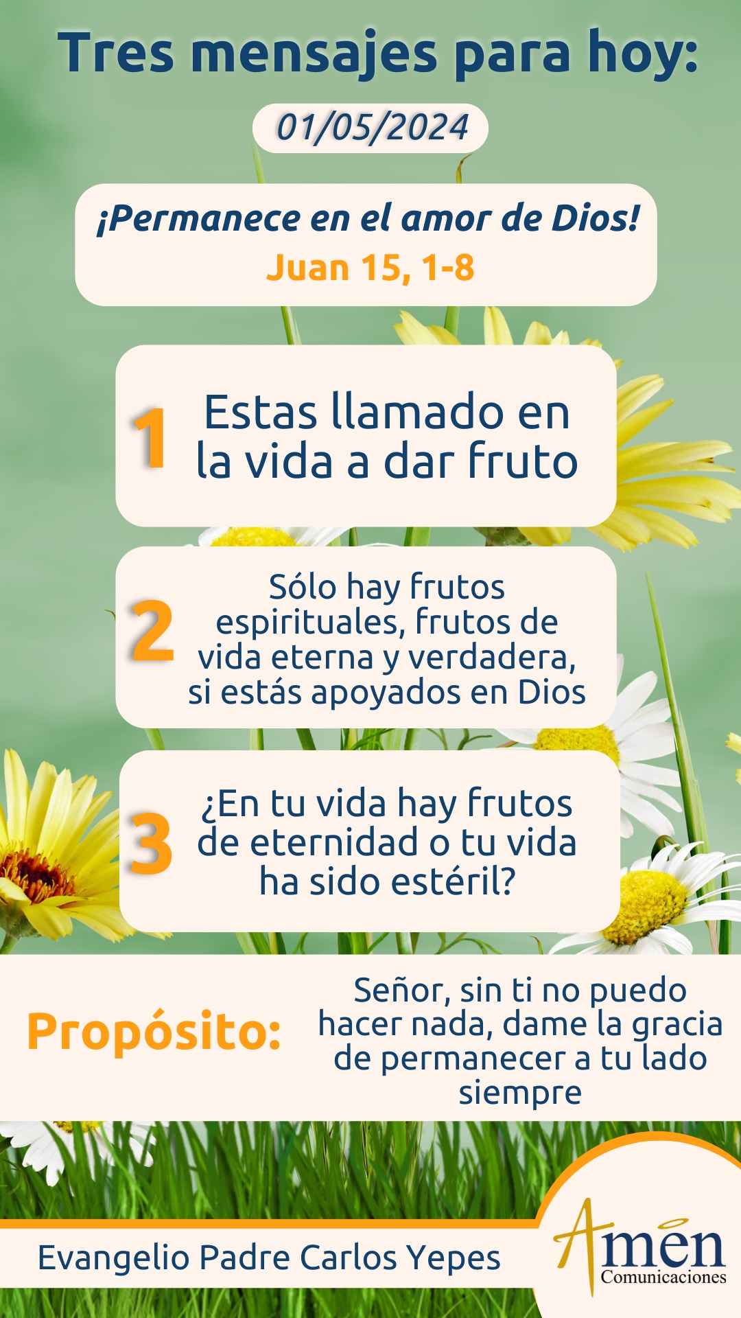 Terminamos nuestra reflexión, retomando el texto precioso de Jesús cuando afirma: “Si permanecen en mí, y mis palabras permanecen en ustedes, pidan lo que deseen y se realizará, se cumplirá”. Cuatro veces aparece en el evangelio de hoy una invitación de Jesús: “Permanezcan en mí”, ¡permanecer en su amistad!, ¡permanecer en su amor!, ¡permanecer en su Espíritu de vida nueva! Es que he visto tantas personas en mi vida como hombre y como sacerdote, que, en principio muy entusiasmadas, se acercan a Jesús con ocasión de una crisis personal, o también de un retiro espiritual, pero pasan los meses y prontamente se enfrían. Hoy el gran verbo sustantivado que aparece en el evangelio es este: ¡Permanece en Mí!, si no estamos unidos y perseverantes en el tiempo a Jesús, no daremos verdaderos frutos; por el contrario, si permanecemos en Jesús y perseveramos en su amor, sus palabras producirán abundantes frutos en nosotros, y todo lo que pidamos por las almas y para el bien de las almas se nos concederá. Padre de familia, sacerdote, empresario que luchas por una familia, una comunidad o una empresa mejor, tal vez has tenido frutos exiguos, pequeños en tu familia, en tu ministerio sacerdotal, en tu empresa, porque quizás no has permanecido profundamente, en la vida divina de Jesús, como la rama del viñedo recibe la savia vital, la savia del Espíritu, del tronco del árbol, que es el mismo Jesucristo.