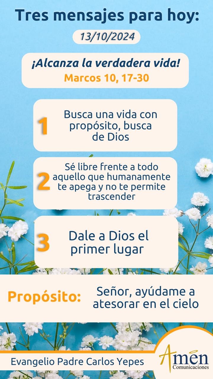 Y es aquí donde encontramos la última enseñanza que acabamos de enunciar, y es esa promesa de premio que ofrece Jesús a todos: “Si somos libres y desapegados por darle el primer amor a Cristo en nuestro corazón, recibiremos centuplicadamente, (100 veces más)”. Esto es una maravilla, aclara Jesús: “Con persecuciones, quizás con envidias humanas, pero, además, recibiremos en el futuro la vida eterna en el cielo”. Esto es negocio redondo por donde se mire, y hoy te pedimos, Jesús, ayúdanos a apuntar a la gran riqueza de la vida, no nos dejes gastar miserablemente las mejores fuerzas de nuestra juventud, adultez o madurez, atesorando cosillas del mundo que las roba el ladrón, o las carcome la polilla, ayúdanos a atesorar en el cielo, donde no hay ladrón que robe, ni hay polilla que carcoma o herrumbre, que oxide los bienes espirituales y eternos que con amor y por amor hemos construido.