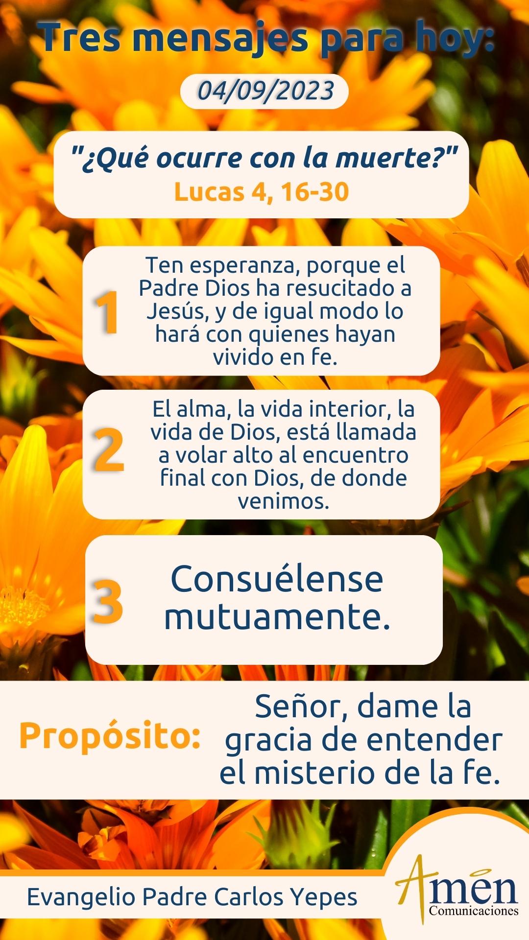 Hoy esta palabra se dirige de manera particular a los que están viviendo recientes duelos con ocasión de la muerte de un ser querido. ¿Siente que no han partido para siempre?, descubre que no te puedes afligir como aquellos paganos que no tienen esperanza, porque el Padre Dios ha resucitado a Jesús, y de igual modo lo hará con aquellos hombres y mujeres familiares nuestros, que han vivido en la fe, la esperanza y el amor.