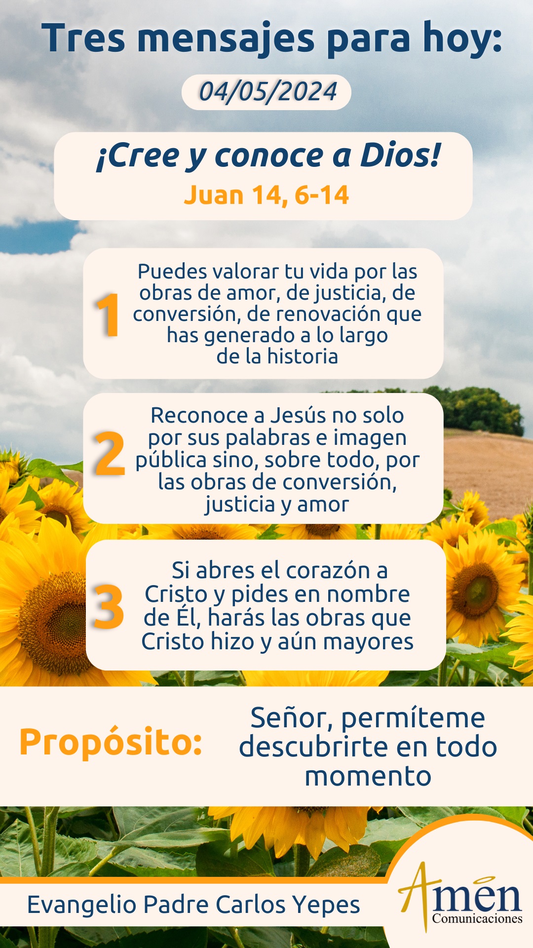 Y culmina el evangelio con una promesa de Jesús, una promesa que realiza con autoridad cuando dice: “Les aseguro” y cuando escuchamos estas palabras, les aseguro, o cuando dice: “En verdad, en verdad les digo”, sabemos que Jesús va a hablar autoritativamente y que lo que va a decir es importante para nuestra vida. Y escuchen esta promesa contenida en el evangelio de hoy y enunciada por Jesús: “El que crea en Mí, dirá Jesús, hará las obras que yo hago, y las hará aún mayores”, y aclarará: “Cualquier cosa que pidan en mi nombre, yo la haré para que el Padre Dios, sea glorificado en el Hijo”.