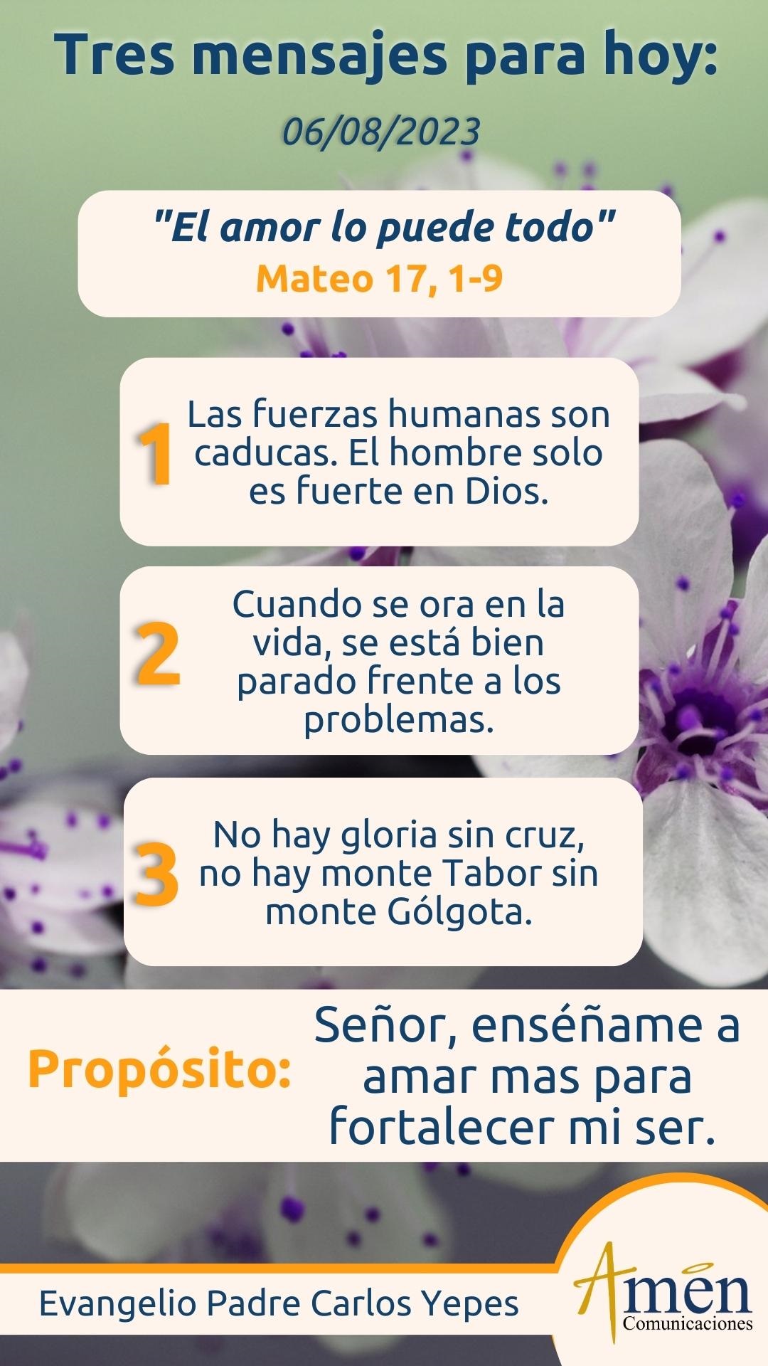 El evangelio hoy nos presenta el relato de la Transfiguración de Jesús frente a Pedro, Santiago y Juan en la altura del monte Tabor; allí aparecen todos los grandes elementos de las teofanías o manifestaciones solemnes, grandiosas de Dios en el Antiguo Testamento. Aparece la montaña, la nube, la luz incandescente, la voz del cielo, el temor reverencial de Pedro, Santiago y Juan y la postración en el suelo ante la gloria de Dios. También se nos muestra el éxtasis de Pedro y la presencia simbólica de Moisés y Elías, que habían fallecido siglos atrás. Este resplandor, que la humanidad recibe en la figura de Pedro, Santiago y Juan, nos muestra a este Jesús transfigurado, que ciertamente ilumina en retrospectiva nuestro caminar en la vida, cuando justo Jesús había hablado de su pasión y muerte y sabía que sus discípulos se iban a escandalizar por ello, tiene que llenarlos de esperanza y darles a probar la luz gloriosa que nos espera a todos y de la cual la Transfiguración es un bello anticipo.