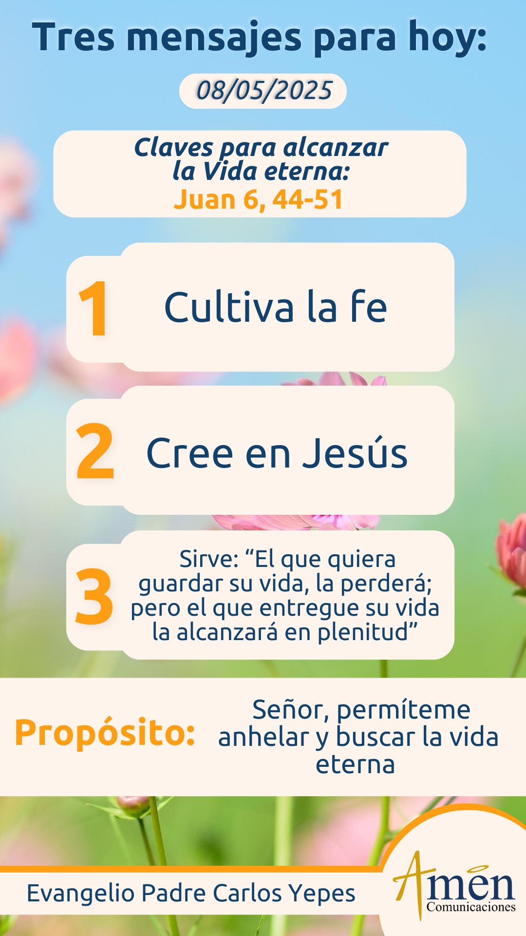 Pero en un segundo momento en el evangelio de hoy, Jesús hará una afirmación lapidaria, de una forma solemne cuando dice “En verdad, en verdad les digo”, y afirmará: “Sólo por la fe se alcanza la vida plena, sólo el que cree tiene vida eterna”. ¿De qué vida estamos hablando?, ¿acaso de la vida del mundo, de la vida laboral, de la vida social, de la vida de bienestar y de algunas comodidades? No, hablamos de una vida que nunca hemos conocido, una vida que se va gestando, va creciendo, se va desarrollando en lo más profundo de nuestro ser, a veces sin que nos demos cuenta y en donde van perdiendo fuerza los llamados valores del mundo y van adquiriendo una nueva dimensión los llamados valores del evangelio, el entender y asumir la vida como amar, como entregarla por los necesitados, por los sufrientes. Por primera vez hacemos una revolución en nuestro interior desde la fe, por primera vez hacemos un verdadero giro copernicano para que lo entendamos mejor, y ya no es el sol alrededor de la tierra, sino la tierra alrededor del sol. Aquí no es vivir en función nuestra, mi bienestar, mi gratificación, mi plenitud personal, sino que es todo lo contrario. La vida se alcanza, la vida se obtiene sólo cuando por la fe en Jesús entendemos que hay que donar la vida. Como he dicho tantas veces: ¡Hay vida en entregar vida a los demás! Si sientes que has hecho algún patrimonio económico, que tienes algún bienestar material, un reconocimiento social, pero te experimentas insatisfecho, incompleto con un silencioso desencanto en tu vida personal, mira en lo profundo de tu ser y con fe escucha el mensaje de Jesús que nos dice: “El que quiera guardar su vida, la perderá; pero el que pierda y entregue su vida, la guardará, la alcanzará en plenitud”. Y esto sólo se da por la fe en Jesús, que nos muestra que entregándonos, que sirviendo, que amando, que donándonos, que gastándonos por los demás, encontramos un sentido para la vida y una plenitud personal que jamás habíamos imaginado.