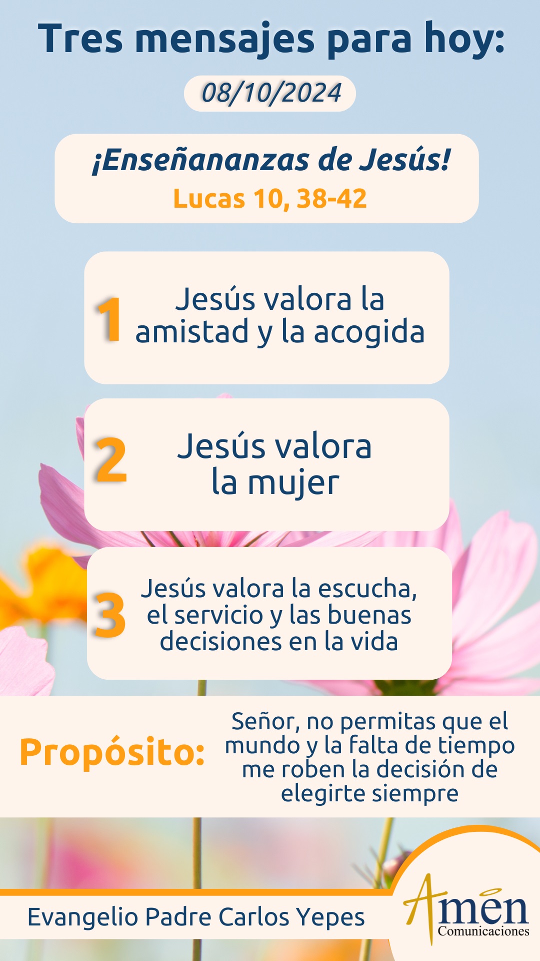 Siete enseñanzas, siete valores: uno, el valor de la amistad, dos, el valor de la acogida, tres, el valor de la mujer, cuatro, el valor de la escucha contemplativa y orante, cinco, el valor del servicio humilde y abnegado, seis, el valor de las buenas decisiones en la vida, y siete, el valor de no dejarnos quitar lo mejor que hemos elegido en la vida, que es Cristo Jesús. Es lo más grande que nos ha pasado, no dejes que el mundo, los compromisos, las prisas, la falta de tiempo, te robe a Dios de tu vida.