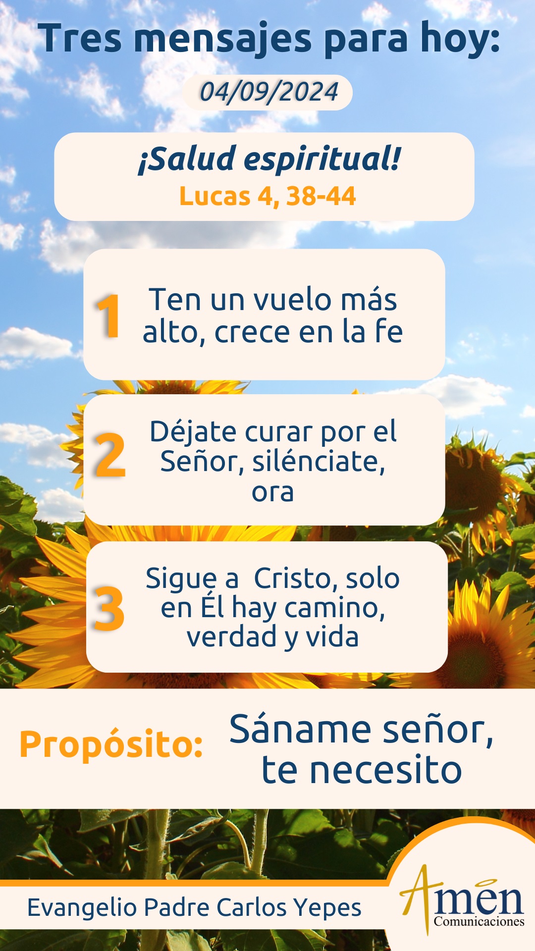Hoy clamemos a Jesús, no solo como la suegra del apóstol Pedro, o como tantos enfermos que le presentaban a Jesús para que les impusiera las manos, digámosle: hoy me siento enfermo, enferma, por una sociedad que al mirar redes sociales nos genera desesperanza y ansiedad, al ver una sociedad convulsa, conflictiva, violenta, injusta en tiempo real y en muchos lugares del planeta. Danos Señor entender que calidad de vida, vida abundante como la que tú ofreces y prometes, es vida con salud y que por más que tomemos pastillas, hagamos yoga, vamos a terapias psicológicas, busquemos obsesivamente descansos en fincas, playas paradisíacas, lugares recreativos, estamos enfermos porque no tenemos a quien es la vida plena, la salud plena, Jesucristo, no tenemos a Jesús profundamente en nuestra vida. Solo en Él volveremos a recuperar, volveremos a tener los ánimos, la esperanza, el consuelo, la fortaleza, la paz del corazón, la alegría y el gusto por vivir, porque Él, más allá de miles de imágenes, miles de mensajes, miles de ideologías políticas, modas culturales que nos dicen aquí y allá, en este influenciador o en este opinador en redes sociales, está la verdad, en ningún de ellos está realmente un modelo válido de vida a seguir.