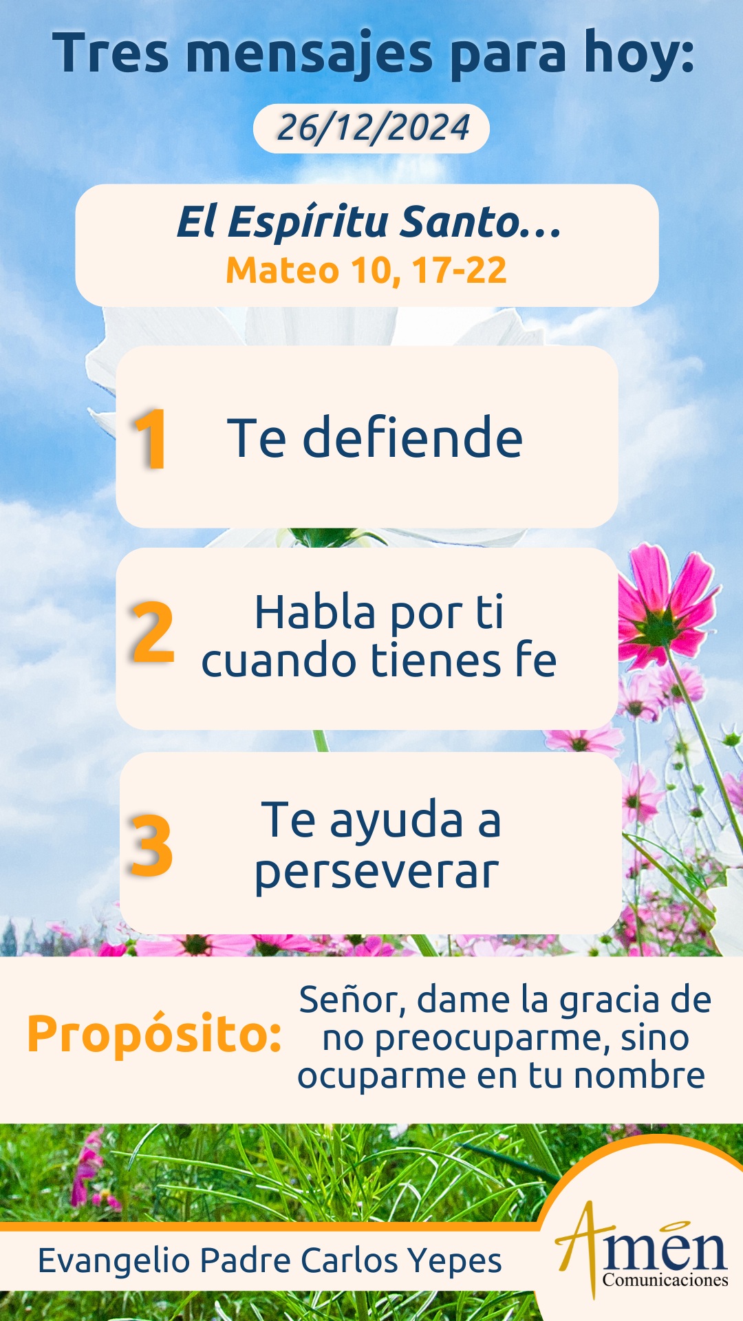 Pero en esta misma línea de la fiesta del martirio de Esteban está el evangelio de hoy, tomado del capítulo 10 de san Mateo, cuando Jesús nos invita: “A no fiarnos como creyentes ni del mundo, ni de la gente del mundo”. De alguna manera nos previene, porque en la gente que no es de Cristo, que no es creyente, habrá traiciones y en el fondo lo augura, lo profetiza Mateo cuando dice: “Los entregarán en los tribunales, los azotarán en las sinagogas, los harán comparecer ante gobernadores y reyes por mi causa”. Pero Jesús da tranquilidad a sus seguidores más allá de la persecución y les dice: “No se preocupen de su defensa y de las palabras que utilizarán cuando comparezcan ante tribunales e importantes del mundo”. Y concluirá diciendo: “El Espíritu de su Padre Dios, hablará por ustedes, de manera que no serán ustedes los que prepararán su defensa, sino que será el Espíritu del Padre de los Cielos”. Concluirá el apóstol y evangelista Mateo, afirmando: “Sólo el que persevere hasta el final se salvará, y es un valor supremo en la vida del creyente la perseverancia en la fe en el Señor, más allá de pruebas y adversidades, y sólo con esta perseverancia alcanzaremos la salvación definitiva del alma”.