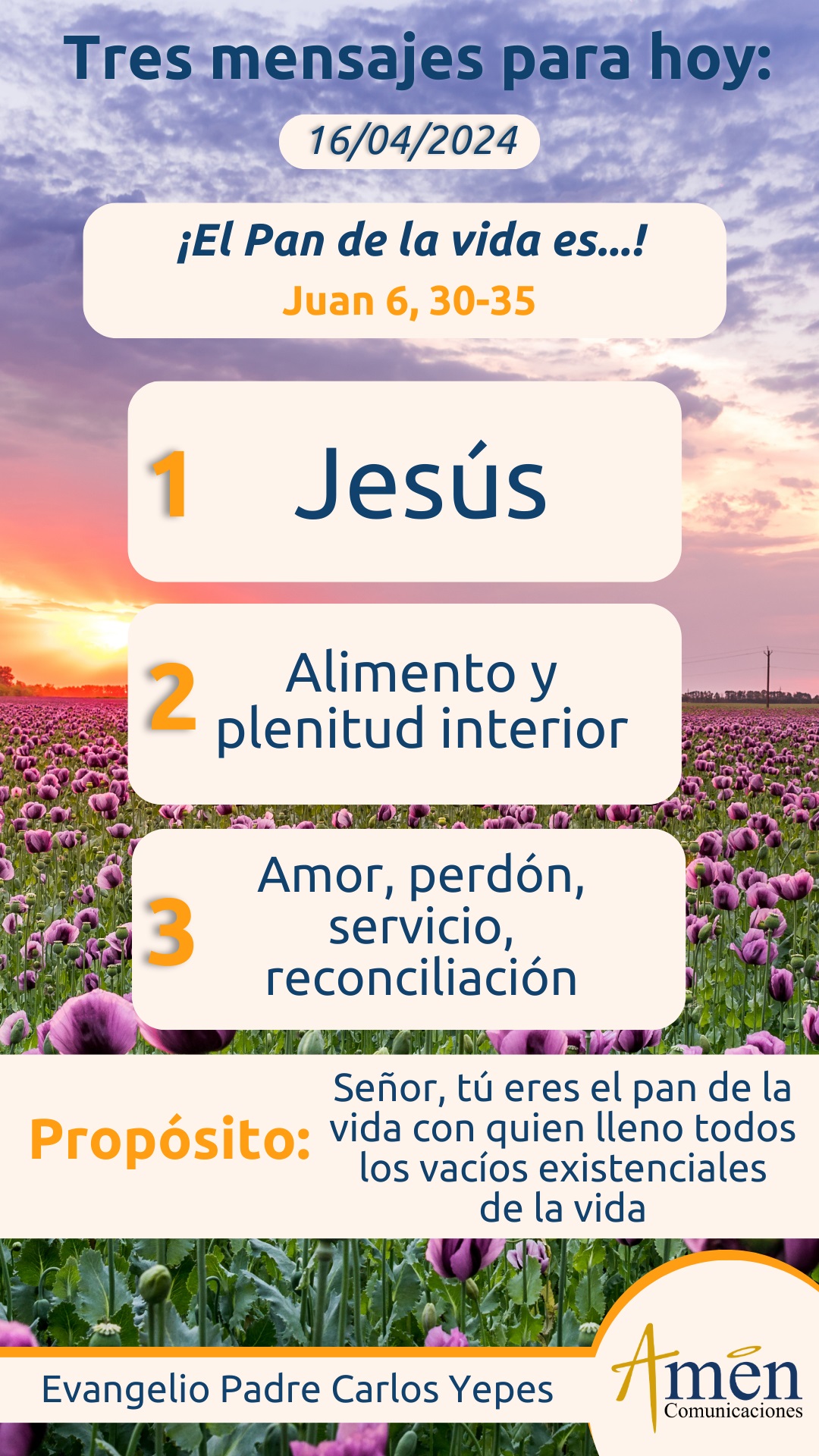 Hoy en tu corazón, pídele con fe: Señor, he recibido tantas propuestas, he mirado tantos proyectos del mundo que me hablaban de felicidad, de plenitud, de realización, y en todos ellos he encontrado de alguna manera, decepciones, desencantos. No he visto ni personas, ni situaciones, ni episodios del mundo que sean capaces de plenificar mi vida; ¿dónde encontrar esa vida plena, ese Pan de vida capaz de realizarme? Ante este interrogante, Jesús hará la más bella afirmación del misterio que acompaña su ser, cuando dirá: “Yo soy el Pan de la vida, el que viene a mí no pasará hambre, y el que crea en mí nunca tendrá sed”. El Pan de la vida es un hombre, el pan de la vida es Jesús, el pan de la vida es su Espíritu, el pan de la vida es un proyecto de existencia, proyecto de vida distinto para ti; el Pan de la vida es su mensaje revolucionario para su tiempo y más revolucionario aún para nuestro tiempo. El pan de la vida es su doctrina de amor, perdón, servicio, reconciliación, aunque ello implique cruz. El Pan de la vida es Jesús, nunca lo olvides: quien coma de este Pan no tendrá más hambre, no pasará más sed, no tendrá más búsquedas, desasosiegos, inestabilidades, vacíos en su vida. Los santos adelantados a su tiempo y a su generación, nos enseñan que fueron plenificados con la vida de Dios en sus vidas; por eso un santo es por excelencia una persona feliz, una persona plena, una persona realizada, una persona completa, una persona equilibrada.