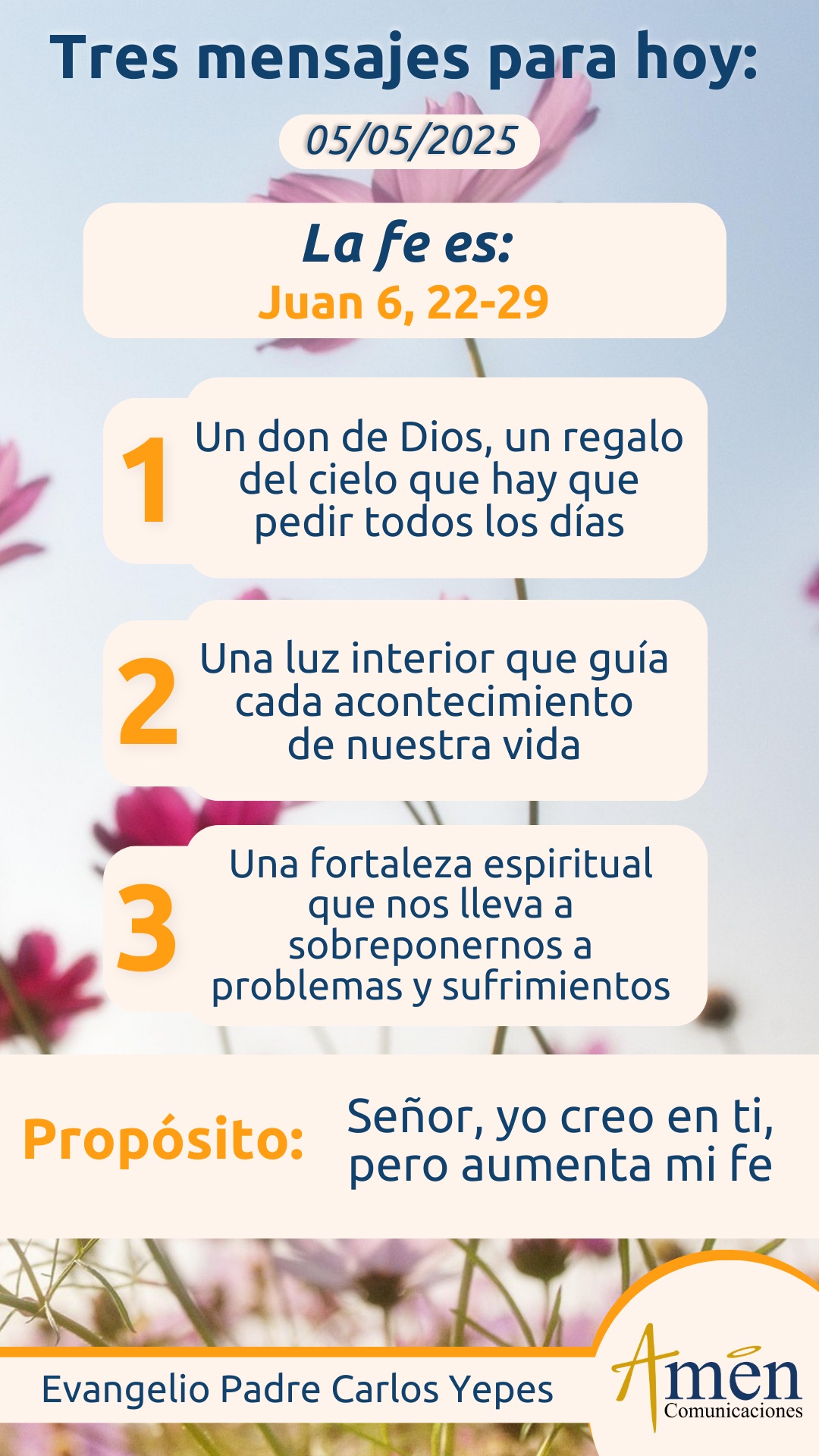 Concluirá el evangelio con un tercer mensaje, cuando aquellos hombres escuchan a Jesús conmovidos en su corazón, se preguntan ¿qué tenemos que hacer para trabajar en lo que Dios quiere para nuestra vida? Y Jesús les responde de manera clara y contundente: “El trabajo que Dios quiere de cada uno de ustedes es que crean en el enviado de Dios, esto es, que crean en Jesucristo”. Estas palabras no se pueden quedar en el pasado, hace 20 siglos, hoy son dirigidas de manera personal a cada uno de nosotros, y se nos pide creer, se nos pide la fe en Jesús, recordando que la fe es sobre todo uno, un don de Dios, un regalo del cielo que hay que pedir todos los días. Dos, la fe es una luz interior que guía cada acontecimiento de nuestra vida y nos lleva a mirarlos con los ojos de Dios. Tres, la fe es una fortaleza interior, una fortaleza espiritual que nos lleva a sobreponernos a dificultades, a problemas, a sufrimientos. Y cuatro, la fe nos permite sobrenaturalizar todos los acontecimientos y descubrir que, más allá de una prueba, una dificultad, un revés o una adversidad que hoy podamos padecer, Dios tiene un propósito con nuestra vida, tiene un proyecto hoy para ti y que de esa dificultad que hoy padeces y quizás de la cual te lamentas, el Señor quiere que hagas aprendizaje para tu vida.