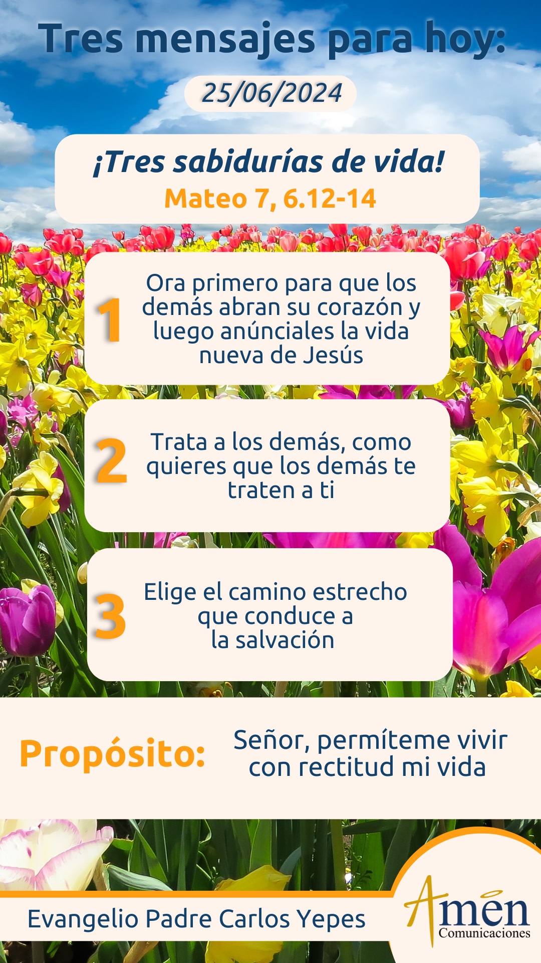 Hoy elijamos el camino estrecho, que implica servicio, compromiso en el matrimonio, en el trabajo, con la pareja, contigo mismo; compromiso con la propia vida, para que demos frutos, aunque nuestra sociedad es tan dada a la vida muelle, perezosa, a la flojera y al bienestar, descubrimos que sólo hay frutos de justicia, sólo hay frutos de amor y de entrega por los demás, cuando somos capaces por el camino estrecho de la cruz, a sacrificarnos y a entregarnos por los demás.