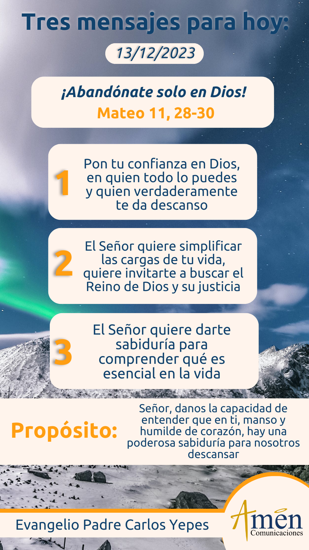 TRANSLITERACIÓN REFLEXIÓN PADRE CARLOS YEPES Con el profeta Isaías aprendimos, que Dios no se cansa, no se fatiga, que es insondable su inteligencia, que Dios da fuerzas al cansado, acrecienta el vigor del inválido; se cansan los jóvenes, se fatigan aún en su juventud y vacilan, pero los que esperan en Dios renuevan sus fuerzas, les nacen alas como de águilas, corren sin cansarse, marchan sin fatigarse. Es precisamente este mensaje de Isaías, capítulo 40, que nos permite entender el evangelio de hoy, cuando Jesús comprendiendo el peso de la vida que llevaban los hombres sencillos de su pueblo por la carga normativa, sobre todo religiosa, 613 normas, les muestra un yugo más llevadero, más suave y ligero. A veces hay tantas leyes humanas, hay tantos compromisos por cumplir, hay tantos pesos laborales, económicos, financieros, familiares, hay tantas actividades por realizar, que nos descubrimos, nos experimentamos abrumados por los compromisos y el peso de la vida. Jesús, en una preciosa y profunda sabiduría, nos invita a reposar en Él, a poner nuestra vida, nuestros empeños, nuestra alma total solo en Él. Él nos promete descanso, reposo para las fatigas de la vida, de alguna manera abrazar su yugo, es ligero, porque más allá de tantas normativas e imposiciones humanas, lo único que nos pide Jesús, es amar al Padre Dios en el amor concreto que tengamos por el hombre. No se trata de mayor número de leyes, se trata simplemente de poner nuestra confianza en Dios, en quien todo lo podemos y quien verdaderamente nos da descanso. Cuántos agobios en nuestra vida hoy, cuánta obsesión por el descanso de fin de año, de enero, de puentes festivos, de fines de semana o weekend; de alguna manera, esta obsesión por el reposo, el descanso, expresiones coloquiales como el necesito desconectarme, necesito parar por unos días. En el fondo suponen que en el hombre, hay una gran tensión existencial, el responder por su vida, atender su matrimonio, responder por su familia, atender en el trabajo, atender compromisos económicos. El Señor quiere simplificar las cargas de nuestras vidas, quiere invitarnos a buscar el Reino de Dios y su justicia, y lo demás, lo económico, lo material, lo humano, se nos dará por añadidura. Pero el ser humano es terco y a veces buscamos más la añadidura, con desesperación, buscamos dinero, seguridades materiales, prestigio humano y no buscamos lo esencial, construir el reino del amor, el reino de Dios. Hoy Señor, te pedimos danos sabiduría, para comprender qué es esencial en la vida, tantos desvelos, tantos trasnochos en nuestra vida y al final terminamos en una cajita con cenizas o bajo tierra. Señor, danos la capacidad de entender, que en Ti, manso y humilde de corazón, hay una poderosa sabiduría para nosotros descansar, descargar los pesos, a veces insoportables que llevamos en la vida. Que el buen Dios te descanse y te repose en este día y te bendiga, en el nombre del Padre y del Hijo y del Espíritu Santo. Amén.