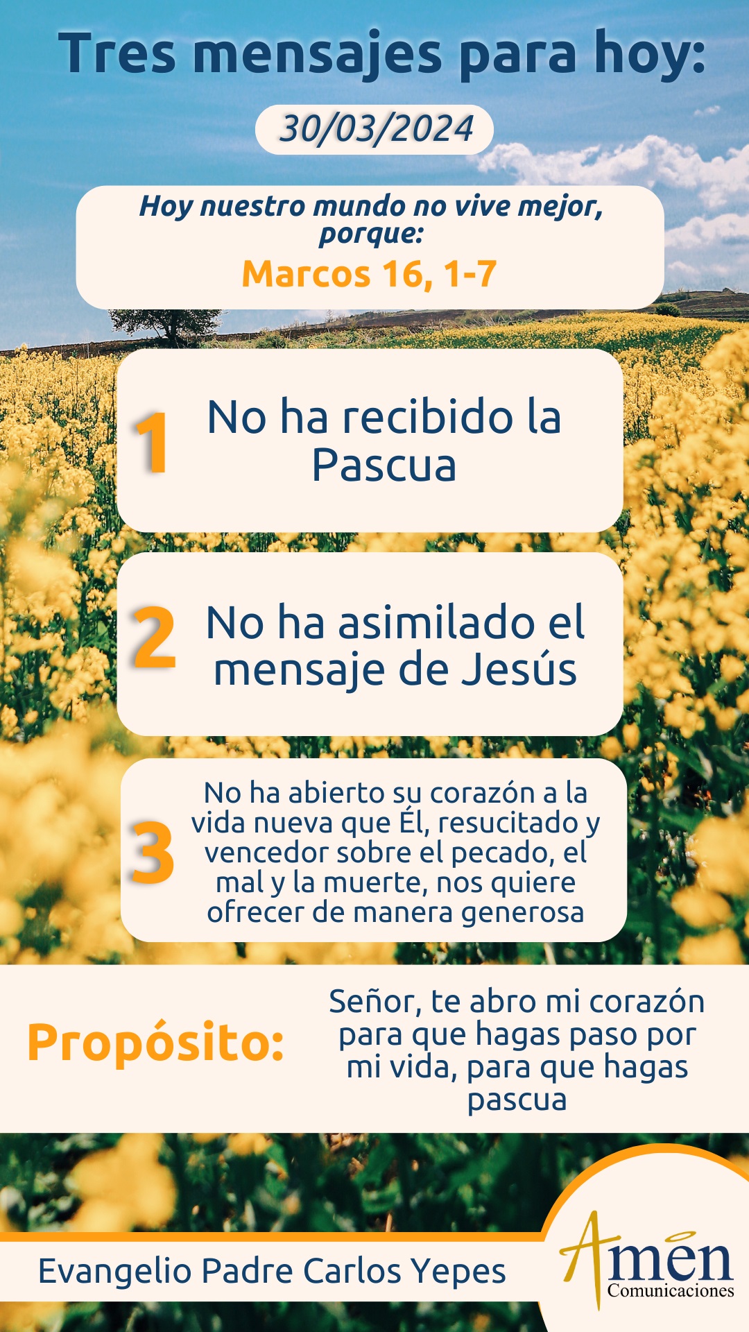 Hoy te propongo de manera muy simple, que esta gran verdad de Jesús resucitado, liberado del sepulcro, caminante por Galilea, aparecido sucesivamente a sus discípulos y a otros más, lo puedas aterrizar como una experiencia de vida en ti, descubriendo que estás llamado no solamente a vivir según tu carne, según tu naturaleza que a veces es egoísta, codiciosa, orgullosa; sino que estás llamado a vivir de manera más espiritual, a vivir de manera más resucitada.