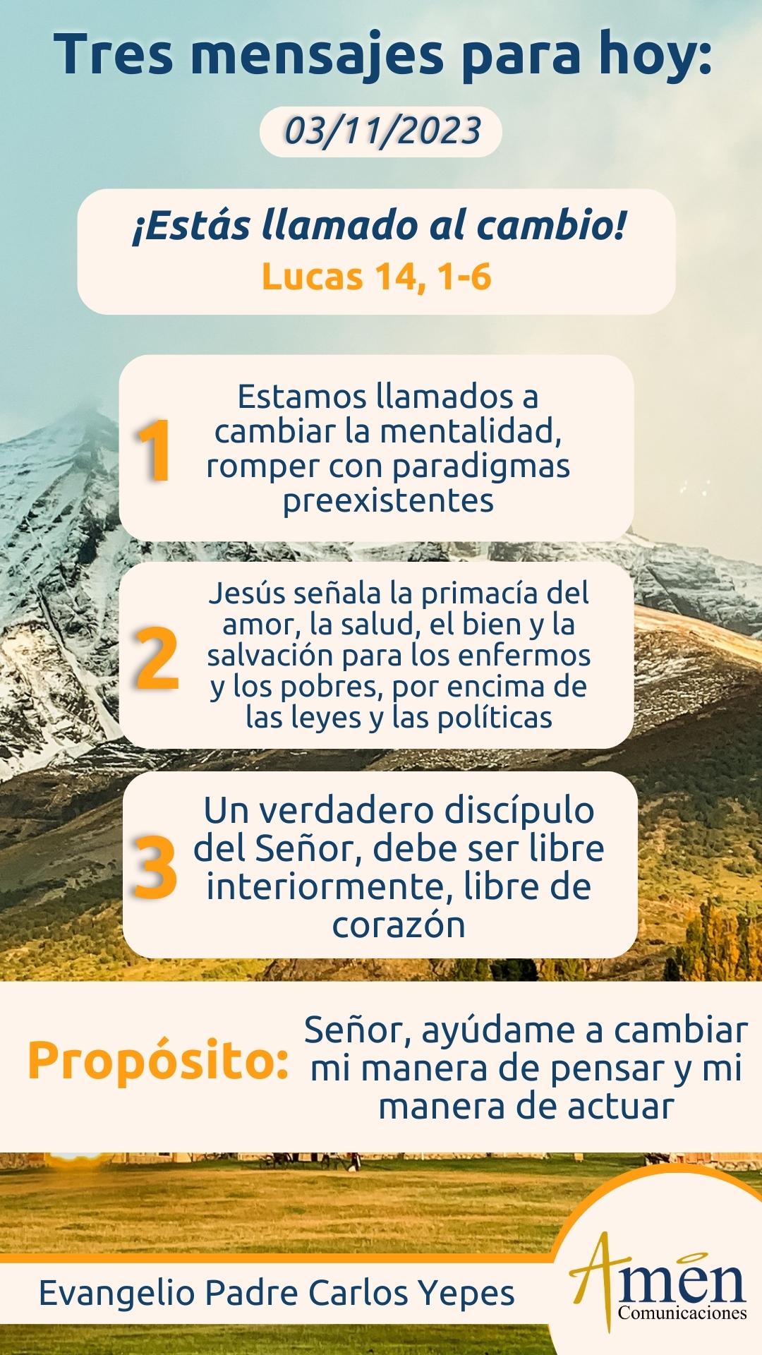 La primera, estamos llamados a cambiar la mentalidad, en el entendido de que es uno de los grandes desafíos en la vida humana; romper con paradigmas preexistentes como los que se daban en tiempos de Jesús cuando se tenía la idea que la ley del Shabat judío, del Shabat religioso (ley del descanso en sábado), era absolutamente inviolable. Jesús desafiando los parámetros de su tiempo cura a un enfermo de hidropesía y de alguna manera muestra, que esa mentalidad de que la ley es absoluta y tiene que esclavizar al hombre, debe ser revertida, debe ser transformada dicha mentalidad.