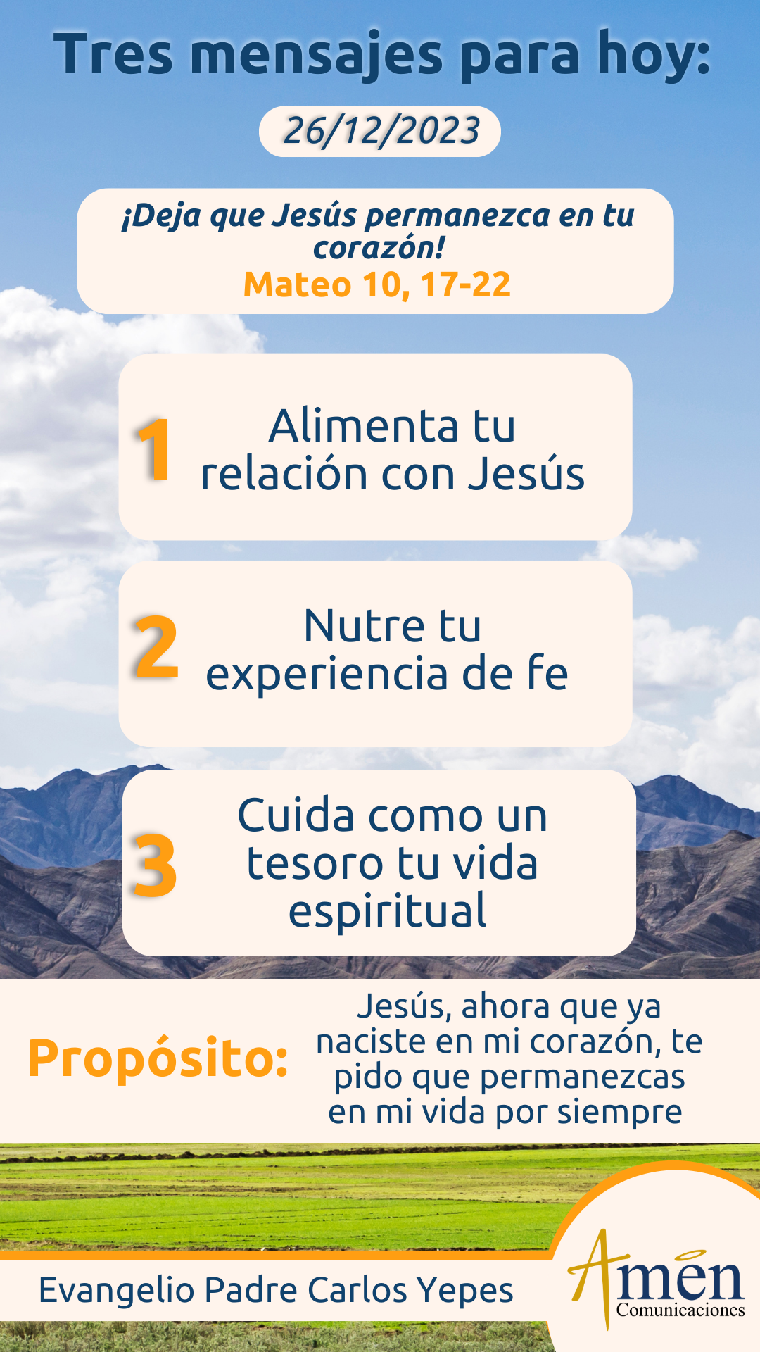 Señor, empezamos este tiempo de Navidad, ha nacido Jesús en mi corazón en el día de ayer y así lo celebramos litúrgicamente, ahora deseo alimentar esa vida, nutrirla, cuidarla con esmero; no se trata simplemente de un acto mágico, no se trata simplemente de una frase estereotipada y funcional diciéndole a otra persona ¡Feliz Navidad!, no. Se trata de reconocer que soy feliz, que estoy alegre, que estoy pleno, que soy afortunado, porque efectivamente ha habido Navidad, Natividad, nacimiento de Dios en mí. Y así como nos dice el evangelista, que Jesús crecía en edad, gracia y sabiduría, que también la vida nueva de Dios crezca en mí y me haga una persona más madura en la fe, más justa, más fraterna, con más capacidad de paz y de perdón frente a los demás.