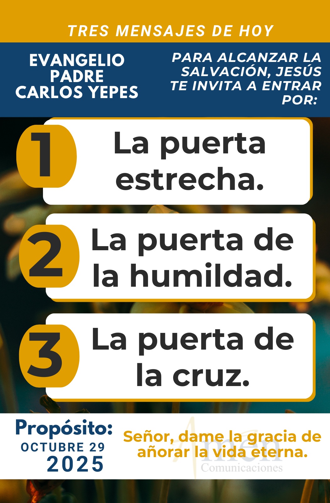 Pero pasemos al evangelio de Lucas, capítulo 13, cuando un espontáneo le pregunta a Jesús ¿serán pocos los que se salven? Y Jesús, sin darle una respuesta directa y sin determinar el número de los que alcancen la salvación, simplemente reorienta la pregunta a lo esencial. Y dirá Jesús: “Esfuércense, (y es un mensaje para todas las generaciones), en entrar por la puerta estrecha”, que, según los padres de la Iglesia, es “la puerta de la humildad”. Y, según otras interpretaciones es “la puerta de la cruz”. Y sin humildad y sin cruz no podemos salvarnos. Y Jesús, retomando la idea del evangelio de hoy, dirá: “Esfuércense en entrar por la puerta estrecha a través de la cruz y de la humildad. Pues les digo que muchos intentarán entrar a la salvación y no podrán”. Y dirán: “Señor, ábrenos”. Pero Él les dirá: “No sé quiénes son. Y al final será el llanto y el rechinar de dientes cuando vean a los grandes patriarcas salvados Abraham, Isaac, Jacob y a todos los profetas en el Reino de Dios y los demás arrojados fuera”.
