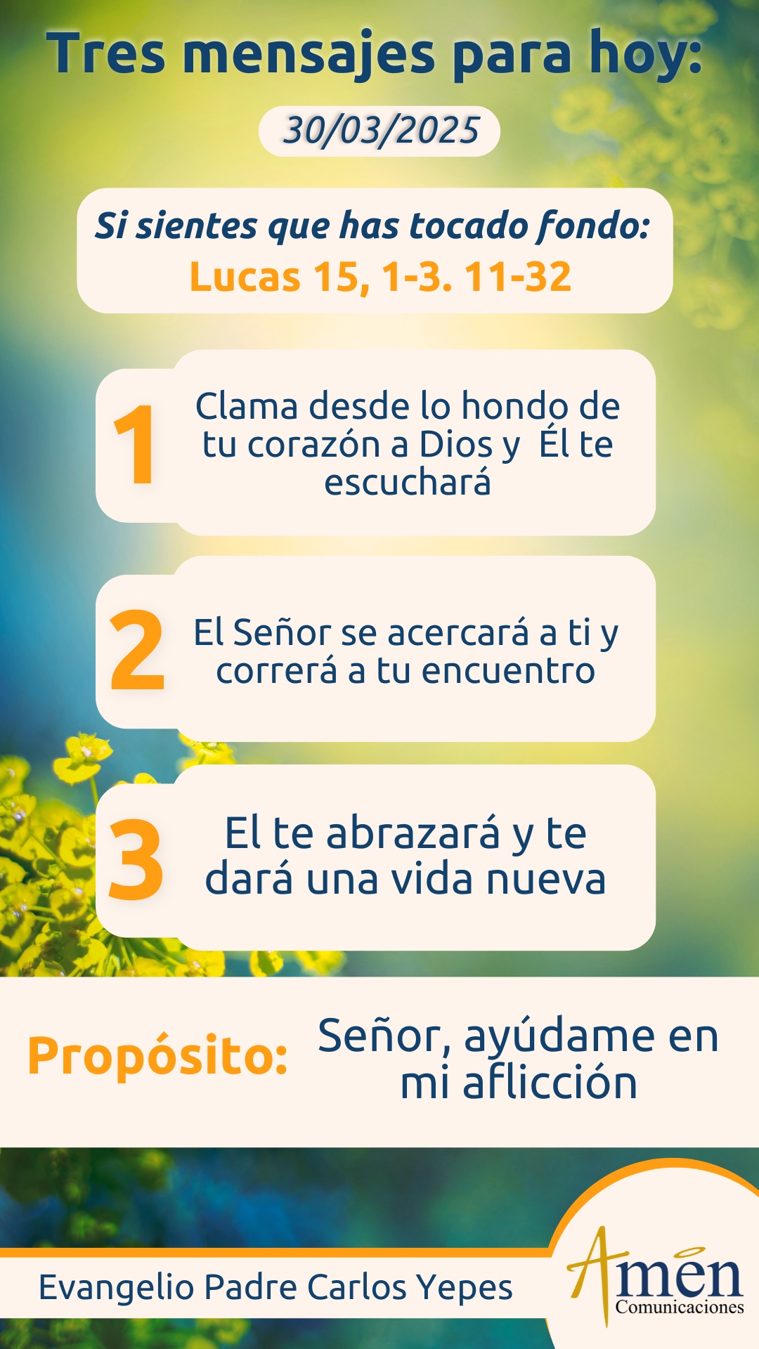 Hoy, si sientes que has tocado fondo en la vida por un tema de alcoholismo, porque tu hogar se desbarató, porque tu salud está muy mal, porque te sientes en una depresión profunda, clama desde lo hondo de tu corazón a Dios, que Él te escuchará, se acercará a ti, correrá a tu encuentro, te abrazará, te cubrirá de abrazos, besos, te pondrá calzado, sandalias nuevas, anillo de la alianza, un traje nuevo, una vida nueva. Créeme que no son los encumbrados los que Dios ama, sino los humillados que han tocado fondo, y recuerda la máxima evangélica: “Todo el que se enaltece será humillado, y, por el contrario, el que se humilla será enaltecido”.