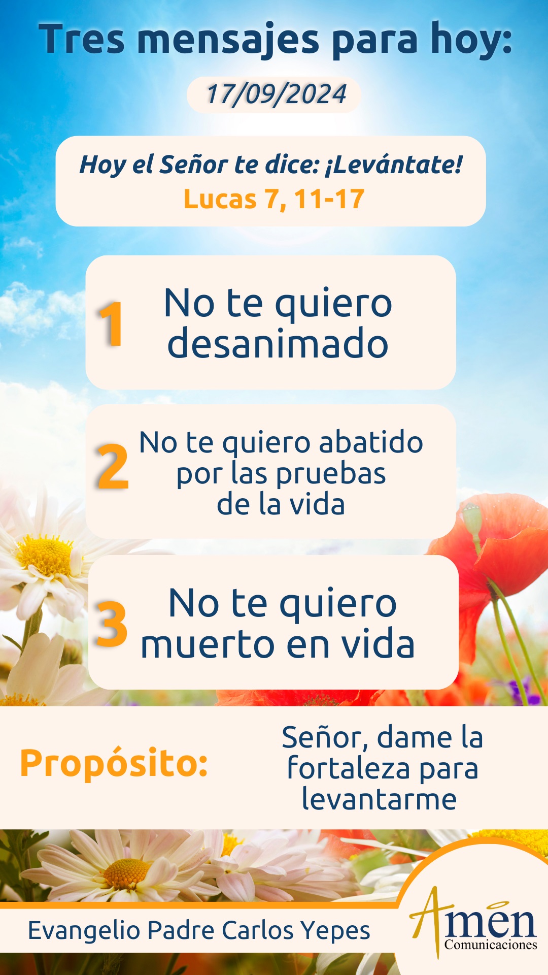 Hoy no te quedes en el hijo fallecido de la viuda de Naín, tú eres ese hijo, esa hija, y hoy el Señor te dice: ¡Ánimo, ponte en pie, levántate, vence los miedos, hoy puede ser el inicio de una nueva vida, de una nueva etapa, de un nuevo comienzo en tu existencia, basta con que me dejes entrar en tu vida y haré un milagro en tu existencia y serás una persona nueva, distinta, restaurada! Levántate, levántate. No coloques tu apoyo en los hombres, no pongas tu seguridad en el dinero, no te confíes demasiado en tu vigor, en tus fuerzas físicas y en tu salud, coloca toda tu confianza y toda tu esperanza solo en Mí. Levántate más allá de ese divorcio, levántate más allá de esa pérdida de empleo, levántate más allá de ese diagnóstico de salud negativo, levántate más allá de la traición o la ingratitud que has descubierto esta mañana o anoche mismo, levántate porque el destino del hombre, del creyente, es el de vivir erguidos, llenos de fe, de esperanza y de amor, no caídos, no derrumbados, no rotos y estallados, así nos quiere satanás, pero Dios en Jesucristo nos quiere hombres y mujeres nuevos, levantados, erguidos, caminantes y atentos a la nueva vida que sólo Jesús nos puede dar.