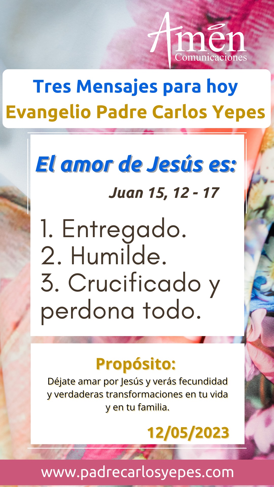 Finalmente, el evangelio nos presenta, como Dios elige al hombre, no es el hombre el que decide amar a la manera de Cristo, Dios nos llama por nuestro nombre, de alguna manera cuando escuchas este mensaje a través de tu computadora, a través de tu celular, es porque en el fondo sientes sed de Dios, búsqueda de infinito, anhelo de eternidad, es Dios que te elige y quiere alimentarte espiritualmente; y Jesús afirma en el evangelio de hoy, que nos llama además de elegirnos por amor, nos llama para dar fruto y un fruto que perdure en el tiempo.