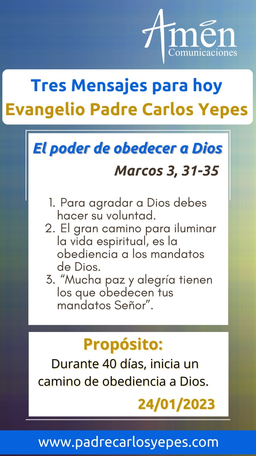 Es que un eje de la fe cristiana es reconocer que la vida no agradamos a Dios, si no somos dóciles a su voluntad. Toda la vida, todo el edificio de la fe religiosa, cristiana, se construye sobre la obediencia a Dios. No todo el que me dice: “Señor, Señor, entrará al reino de los cielos, sino el que escucha y cumple la voluntad de mi Padre del cielo”, a firmará Jesús, en otro pasaje evangélico. En el fondo nos indica, que la gran fuerza, el gran camino para nosotros iluminar nuestra vida espiritual, lo hallamos por el sendero de la obediencia a los mandatos de Dios. Hoy te hago una pregunta, ¿te has pasado la vida obedeciéndote a ti mismo?, ¿has pasado la vida haciendo caso de lo que te dicen tus amigos, tus jefes en la empresa, alguna persona que oyes en la televisión y que admiras? Pero has descubierto que en esa obediencia a los hombres falta camino para la verdad, y no hay plenitud total.