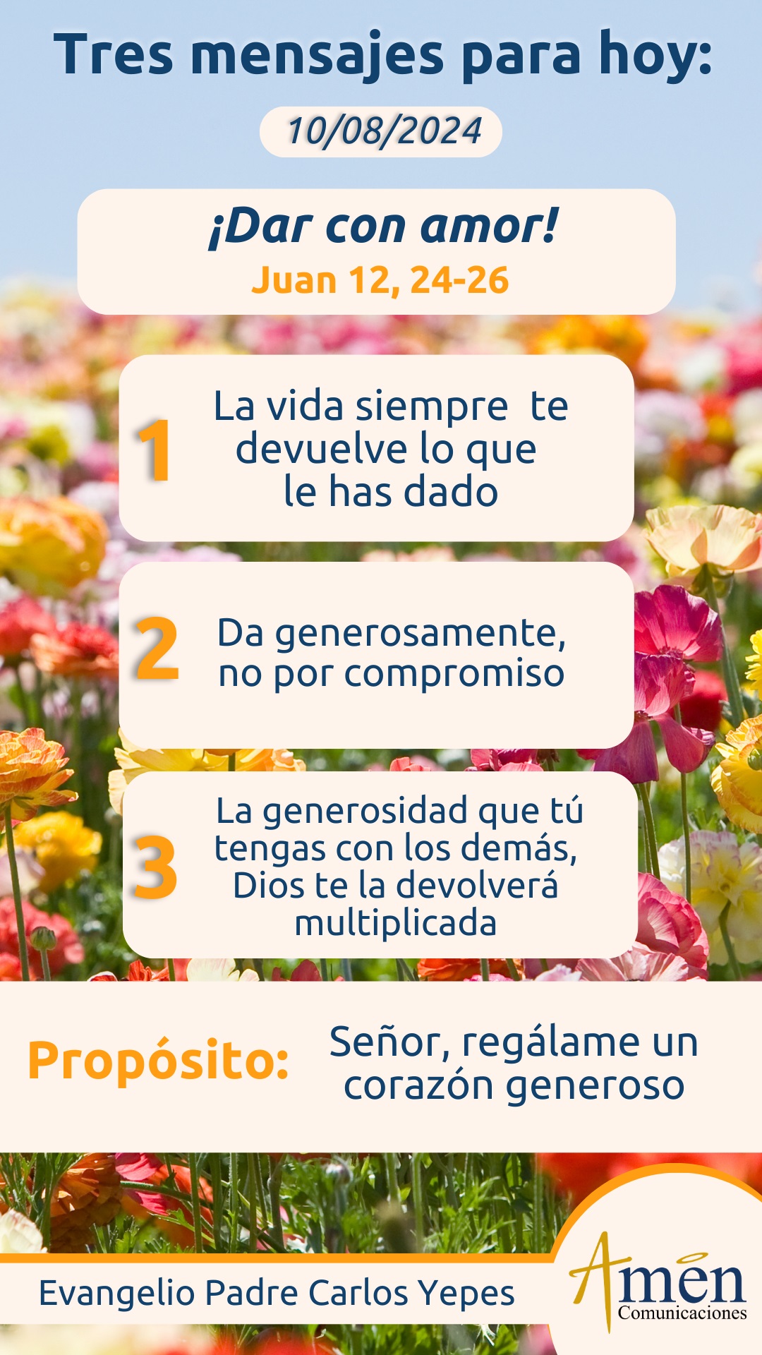 Y he aquí que hay una segunda enseñanza de esa primera lectura cuando dice: “Cada uno sea generoso y dé a los demás como haya decidido su conciencia, no lo haga con disgusto, con dolor, con rabia, ni por compromiso; porque aquel que da de buena gana, aquel que es generoso por amor y por un buen corazón, Dios lo ama. Qué expresión tan bella y tan afortunada, cuando puedes decir en tu vida, Dios no me ama lo suficiente, ¿cuál es el camino para que Dios me ame?, encuentras aquí una bella receta o sabiduría de vida: “Da generosamente, no por compromiso, sé una persona solidaria, no con disgusto, comparte con los demás por un buen corazón y la vida te lo devolverá”.