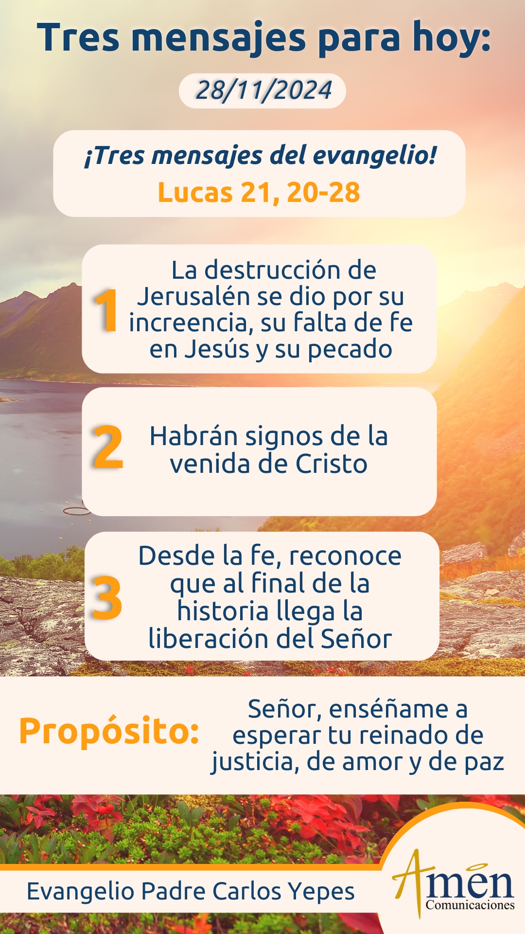 Tres palabras: reconocer primero la destrucción de Jerusalén por su increencia, su falta de fe en Jesús y su pecado. Segundo, reconocer los signos de la venida de Cristo a través de señales perturbadoras y de alguna manera una crisis cósmica mundial. Y tercero, invitarnos al coraje y a la esperanza, porque se acerca nuestra liberación. El hombre no puede dejar de esperar, tenemos que ser hombres y mujeres que desde la fe reconozcamos que el final de la historia no es la destrucción del cosmos o del planeta; sino que el final de la historia es un final de esperanza, donde Dios establecerá su reinado de justicia, de amor y de paz.