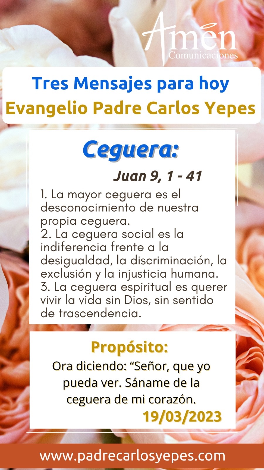 De alguna forma podemos afirmar, que la gran ceguera del ser humano hoy, es la ceguera del corazón que se manifiesta bajo el pecado en cualquier forma: el orgullo nos enceguece, la codicia de bienes nos enceguece, la envidia nos enceguece, la lujuria nos enceguece, el rencor nos hace ciegos.