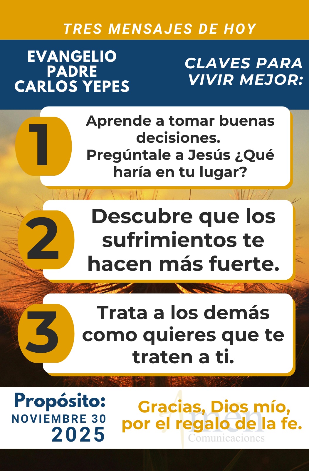 TRANSLITERACIÓN REFLEXIÓN PADRE CARLOS YEPES ¡Decálogo para Vivir Mejor! Con inmensa ilusión y alegría empezamos un nuevo año litúrgico para cientos de millones de cristianos católicos en el mundo entero. Lo que es el año civil o cronológico que se inicia un 1 de enero, es este domingo primero de Adviento para los creyentes en Dios. Empezamos con este llamado tiempo de Adviento, advenimiento o preparación a la Navidad, natividad o nacimiento de Jesús, que de manera mística quiere nacer en el alma de cada uno de los creyentes, en el seno de nuestros hogares y en el corazón de la humanidad entera. Con la misma ilusión con la que una madre embarazada espera y anhela amorosamente la formación, la gestación de su bebé y espera darlo a luz. Nosotros, en este corto tiempo del Adviento, que concluirá iniciando el día 25 de diciembre de Navidad, con anhelo, con esperanza, de manera vigilante y también de manera amorosa, esperamos el nacimiento espiritual de Jesús en el corazón de cada uno. Y queremos alimentarnos en este proceso de la Palabra del Señor, de los sacramentos, especialmente la Eucaristía, de las visitas frente a Jesús Sacramentado. Queremos sentir más allá de los atafagos propios del mes de diciembre que coincide normalmente con el Adviento. Queremos tener paz en el corazón, tiempo para escuchar la voz de Dios. Hoy te propongo un decálogo para vivir mejor. A propósito de que las lecturas de este día que han sido presentadas en días precedentes, pero ahora las leemos en clave de Adviento, nos invitan a la vigilancia de la vida para tomar buenas decisiones, para prepararnos adecuadamente a la llegada de Jesús Niño en la vida de cada uno de nosotros. Empecemos este sencillo y práctico decálogo que puede ser una buena preparación, una actitud vigilante y esperanzada para vivir el Adviento, que justo hoy, como tiempo litúrgico, estamos comenzando. Primera palabra, aprende en la vida a tomar buenas decisiones. Recuerda que las buenas o malas decisiones de tu pasado marcan tu presente; y las buenas o malas decisiones de tu presente marcarán tu futuro. En una segunda frase, aprende en este Adviento que las adversidades, pruebas y sufrimientos de la vida nos tienen que hacer más fuertes, no más duros o amargados de corazón. La humanidad, el mundo de hoy, necesita dulzura, no amargura. Perdonar en este Adviento y futura Navidad, es el gran regalo que nos podemos dar a la vida. Comprender a quien nos cuesta comprender será una táctica maravillosa para vivir las relaciones interpersonales. No repasemos, no repitamos, no recordemos las ofensas que otros nos han causado. No repases en tu mente. No repitas en tu boca, en tus labios. Y no recuerdes en tu corazón la cicatriz o la herida de otros. En una tercera frase para este Adviento, recuerda que la humildad es la virtud que abre la puerta de todos los corazones. La humildad es una gran sabiduría que nos hace que seamos amados por Dios, aceptados y acogidos por los hombres. En una cuarta frase que nos sirve como filosofía espiritual para vivir este Adviento y próxima Navidad, nunca nos arrepintamos de obrar rectamente. Sintamos la alegría y la paz de una conciencia tranquila. Aprende “que el malvado, aunque de momento triunfe, al final termina enredado en la propia telaraña de intrigas que ha tramado”. Por el contrario, “el hombre recto y justo, aunque viva intrigas y pruebas y las padezca, es siempre cuidado, sostenido y protegido por Dios”. En una quinta afirmación, te invito para que en todos los proyectos de tu vida: comprar, vender, crear una línea de negocio o emprendimiento, conseguirte una pareja, trabajar en otro país. En todas las decisiones de tu vida, pregúntale a Jesús en oración ¿Tú qué harías en mi lugar?, ¿Tú qué decisión tomarías si estuvieras en la circunstancia que yo estoy viviendo? Recordando la afirmación del apóstol Pablo a los filipenses: “Tengan los mismos sentimientos de Cristo Jesús”. Por eso, en este Adviento que hoy iniciamos, pregúntale al Señor en toda circunstancia de tu vida, ¿Tú qué harías?, ¿cómo responderías?, ¿cómo hablarías?, ¿cómo decidirías si estuvieras en mi lugar? En una sexta afirmación recuerda, que el amor es la única verdad que hace grande la vida. Fuimos y fuiste creado por Dios para amar y para ser amada, para ser amado; y no amar es traicionar radicalmente la misión de vida que se nos ha encomendado. Recuerda que en esta próxima Navidad del 25 de diciembre viene el amor encarnado, el amor hecho hombre, el amor hecho bebé, hecho niño. Viene a compartir tu vida y la mía para enseñarnos una nueva forma de ser, una nueva manera de relacionarnos, una nueva y distinta forma de amarnos. Ama a tu familia, ama tu trabajo, ama tus proyectos, ama al sufriente, ámate a ti mismo. Ama la vida, que es el único camino de verdadera plenitud. En una séptima enseña, reconozcamos que la gente creyente, con una fe y una esperanza sincera en Dios, que habla con el buen Dios cada día en su corazón, sufre menos, maneja mejor las pruebas de la vida y es una persona más serena y más feliz. Si eres creyente, si sientes que Jesús verdaderamente viene a tu vida y no simplemente en la representación de un pesebre, de un belén; sino que nace dentro de ti, entenderás mejor la vida, asumirás mejor los dolores, la enfermedad, la vejez, la soledad. Porque más allá de todas estas realidades profundamente humanas y universales, te sentirás siempre acompañada, acompañado por el buen Dios. En una octava afirmación te invito, a que en este Adviento y en Navidad, como nos enseñó Jesús, “tratemos a los demás como queremos que ellos nos traten a nosotros”. O dicho de manera negativa: “No hagas a los demás lo que no quieres que te hagan a ti”. Esta regla de oro en la convivencia humana, que es una preciosa máxima evangélica, de verdad que es todo un proyecto de vida para asumir en este Adviento como una m