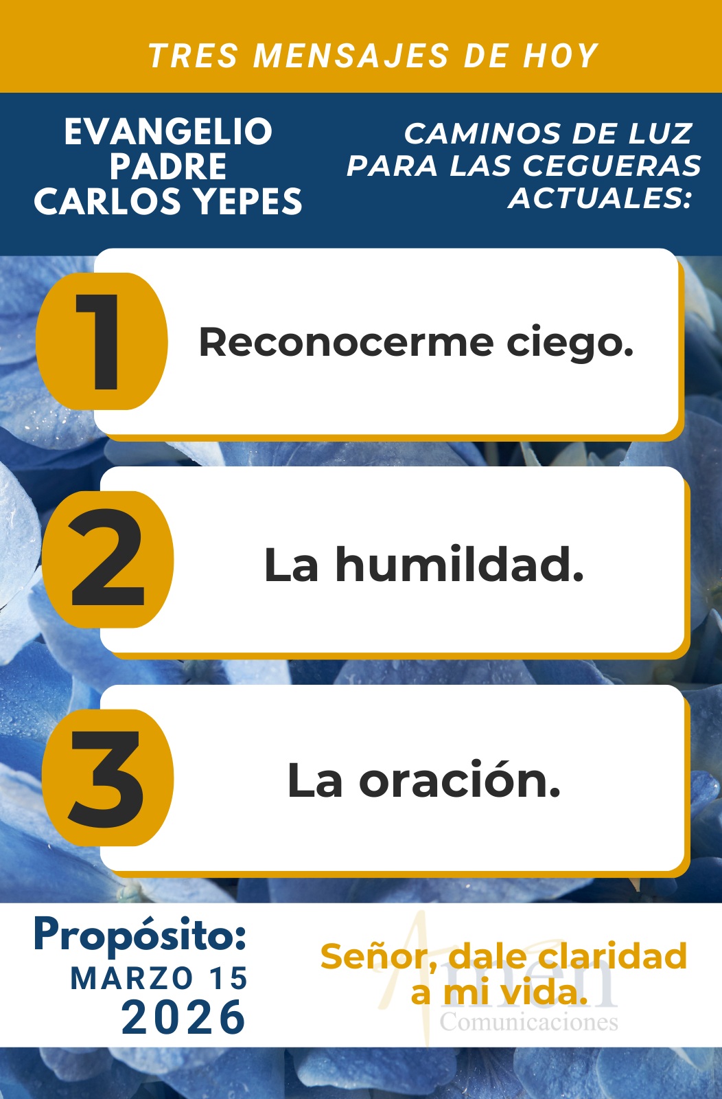TRANSLITERACIÓN REFLEXIÓN PADRE CARLOS YEPES ¡Caminos de Luz! A partir del Evangelio de hoy, donde Jesús sana a un ciego de nacimiento, encontramos grandes enseñanzas para nuestra vida. La primera, es que la mayor ceguera es el desconocimiento de nuestra propia ceguera. A veces vivimos creyendo ver, creyendo estar en la luz, por tanto, no buscamos curación, no buscamos recibir la luz; muchos de nosotros podemos vivir y morir en oscuridad, sin ser conscientes de ello. Hoy el Evangelio de Juan, nos presenta una finísima ironía, la luz progresiva del ciego de nacimiento, propia del hombre humilde, luz primero en sus ojos y luego en su corazón, cuando llama a Jesús un hombre que lo ha curado, lo obedece, lo califica de profeta y luego lo llama Señor postrándose ante Él. Es un descubrimiento progresivo del señorío o poder de Jesús sobre su vida; por el contrario, descubrimos la ceguera progresiva de los fariseos, propia de los hombres orgullosos, que primero andan divididos sobre la identidad del ciego sanado, luego quieren colocar la ley del sábado por encima de la sanación de un hombre enfermo, luego con gran incredulidad preguntan al ciego y a sus padres, persisten con terquedad en su corazón cerrado, en volver a preguntar ¿quién es el que ha sanado al ciego? Y finalmente con injurias y soberbia expulsan al ciego de la sinagoga y no reconocen su propia ceguera frente a Jesús. De alguna forma podemos afirmar, que la gran ceguera del ser humano hoy es la ceguera del corazón que se manifiesta bajo el pecado en cualquier forma: el orgullo nos enceguece, la codicia de bienes nos enceguece, la envidia nos enceguece, la lujuria nos enceguece, el rencor nos hace ciegos. Hoy, sin embargo, esto no es tan claro en la sociedad, porque hay una pérdida de la conciencia del pecado, pudiéramos llamar a esto una ceguera moral, donde no diferenciamos el bien del mal, lo que conviene de lo que no conviene. Pero hay una segunda ceguera en el hombre de hoy, la ceguera social, cuando somos tan indiferentes frente a la desigualdad, la discriminación, la exclusión y la injusticia humana, cerramos la mirada ante el necesitado para no verlo o simplemente ignorarlo. Una tercera ceguera del hombre de hoy es su ceguera espiritual, el proyecto de querer vivir su vida sin Dios, sin sentido de trascendencia, sin reconocer que la vida solamente desde lo biológico, material es una vida pequeña y recortada, que el hombre necesita trascendencia, espiritualidad cualquiera que sea el credo religioso que dice profesar. Una cuarta ceguera en el hombre de hoy es su ceguera antropológica. Hoy el hombre no tiene claridad sobre la verdad de él como hombre o de ella como mujer, se busca redefinir el matrimonio, redefinir la familia, redefinir el género por ideologías absurdas que como modas llegan a nuestra sociedad, se ha perdido el sentido de la vida. Hoy se le da más importancia al hacer que al ser, al tener cosas que, al amar personas, es una ceguera antropológica. Pero encontremos caminos de luz para nuestra vida, ¿cómo iluminar nuestro corazón?, ¿cómo sanar nuestra ceguera interior? De manera conclusiva presentemos estos caminos de luz para nuestra existencia. El primero, reconocerme ciego, mirarme con sabiduría en la vida. Solo el autoconocimiento es el camino de una verdadera sabiduría y nunca buscaré luz, si no me siento ciego en el corazón, como un alcohólico nunca buscará salir adelante de su adicción si no se reconoce alcohólico. Un segundo camino de luz es la humildad. Solo el humilde camina en la verdad, saber que necesito de Dios, que por mis propias fuerzas no soy capaz, imitar al ciego del Evangelio de hoy, que postrado corporalmente ante Jesús, con humildad lo llama Señor, el que tiene señorío sobre su vida. Un tercer camino de luz es la oración, que por la palabra de Dios ilumina nuestra vida, confronta nuestras equivocaciones y nos muestra el camino que Dios desde siempre ha tenido proyectado para nosotros. Un cuarto camino de luz es el de la cruz. El sufrimiento, el dolor, los reveces, las adversidades de la vida como nos desinstalan, nos sacan de nuestra zona de comodidad y nos confrontan con lo profundo de cuál es la misión en nuestra vida. Un quinto camino de luz, el más fuerte del Evangelio de hoy, es la fe en Jesús. El ciego primero lo llama hombre, luego profeta, luego enviado de Dios o Mesías; finalmente lo llaman Kyrios, Señor, Hijo del Hombre y se postra ante Él. Un sexto camino de luz es la esperanza, que ilumina nuestro futuro y nos permite no desesperarnos más allá del túnel que podamos estar padeciendo. Un séptimo y final camino de luz, es el amor que ilumina las relaciones entre las personas, permitiéndonos nuevas dimensiones en la vida. Hoy pregúntate: ¿hay luz en tu corazón?, ¿eres una persona iluminada?, ¿iluminas la vida de los demás?; o por el contrario ¿la vida te maneja a golpes caprichosos, por modas pasajeras? Señor, que yo pueda ver, sáname de mis ojos, pero sobre todo sáname de la ceguera de mi corazón. Que el Señor te bendiga abundantemente en este día. En el nombre del Padre, y del Hijo, y del Espíritu Santo. Amén.