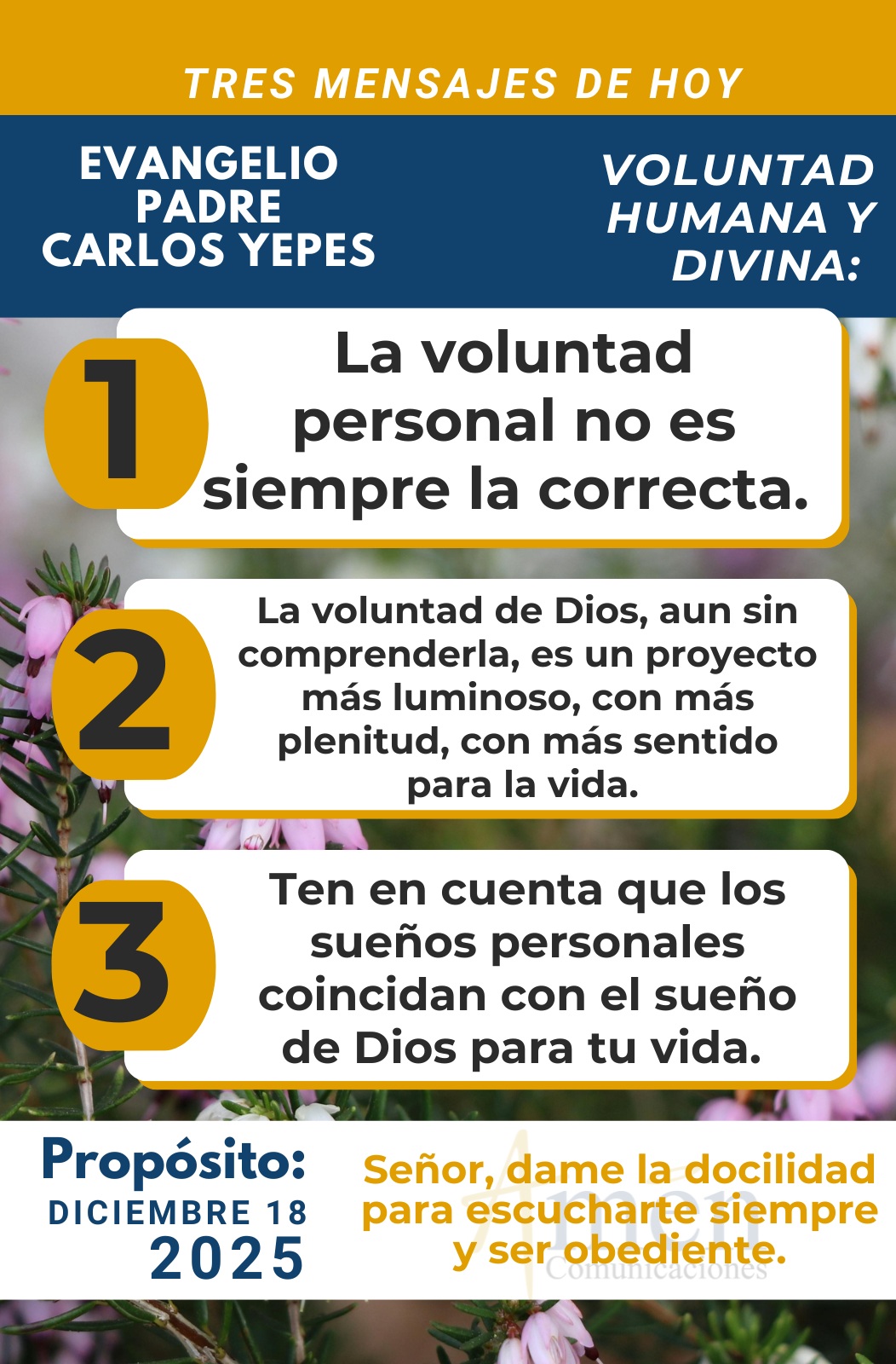 TRANSLITERACIÓN REFLEXIÓN PADRE CARLOS YEPES ¡Dios Habla en los Sueños! La primera lectura tomada del Libro de Jeremías en el capítulo 23, nos muestra como el profeta nos habla de que, tras censurar a los jefes de Israel como malos pastores, porque abandonan a su rebaño, (según también lo había dicho en su momento el profeta Ezequiel). Jeremías quiere profetizar el futuro, el regreso del destierro como un signo claro del Reino de Dios, del comienzo de una nueva era. Y esta nueva era, la va a realizar un rey prudente del linaje de David, un germen justo que es una designación, de alguna manera de lo que es el Mesías de Dios. Su nombre sintetizará el cumplimiento de ese ideal de los profetas y de la nueva era, los nuevos tiempos. Cuando, hablando del Mesías, dirá: “El Señor es nuestra justicia, es el Emmanuel, el Dios con nosotros”. Y esa justicia de Dios que no habla necesariamente de un derecho en términos jurídicos o con una noción jurídica, sino de justicia desde la perspectiva de la salvación. De hecho, los profetas hablaran: “Dios es nuestra salvación y nos salvará mediante la comunicación, la donación de su santidad, que es fruto por excelencia del Espíritu Santo, el Espíritu Divino y que se da a través de la obra de la creación, de la transformación de nuestra vida, de la santificación de nuestra existencia, y al final de la salvación de nuestra alma”. Por eso entonamos alegres: “Que en sus días florezca la justicia y la paz abunde eternamente”. Y entonamos alegres esta respuesta con el salmo litúrgico de este día, que nos invita a entender “que el Mesías Salvador librará al pobre que clamaba, acompañará al afligido y al triste que no tenía protector. Se apiadará del indigente, salvará la vida de los pobres. Por eso es bendito el Señor, el Dios de Israel, el único que hace maravillas. Será bendito y glorioso su nombre y su gloria llenará toda la tierra”. Amén. Amén. Pero pasemos al evangelio de san Mateo en el capítulo 1, versículos 18 al 24, donde reconocemos que la colaboración de los hombres siempre es necesaria en toda la historia de la salvación de Dios con su pueblo. En el evangelio de hoy se realiza sobre todo por medio de la Santísima Virgen María, como una mujer que dio una respuesta generosa y fiel, y se realiza también a través de San José como el hombre justo y creyente que actuará como hijo de David y heredero de todas las promesas contenidas a lo largo de la Biblia. Esta colaboración divina y humana se realiza también hoy en el siglo XXI, en nuestra historia personal de salvación, donde reconocemos que nos abrimos al don de Dios y también buscamos esa conquista humana del don divino. Pero miremos cómo Dios nos habla y encontramos una manera muy particular de hacerlo. Tanto en el José del Antiguo Testamento como en el José, esposo de María en el Nuevo Testamento, cuando Dios le habla en sueños. En efecto, nos dirá el evangelio de san Mateo “que María, comprometida en matrimonio con José, resultó que esperaba un Hijo por obra del Espíritu Santo; y José, el varón justo, el varón recto, decidió repudiarla según la ley mosaica, pero no de manera pública, que se expondría a que ella fuera apedreada, si no en privado y de alguna manera teniendo compasión de Ella”. Pero apenas había tomado esta decisión, Dios interviene, envía un ángel o mensajero que le habla nada menos que en sueños a José, y le dice: “José, hijo de David, (entiéndase descendiente de David o del linaje davídico), le dirá a José, no temas acoger a María por esposa, porque la criatura que hay en Ella viene por la acción del Espíritu de Dios. Dará a luz un Hijo y tú le pondrás por nombre Jesús, Yeshua o Yeshúa que significa Dios Salvador, (porque el nombre está asociado a una misión) y Jesús que significa Dios salva o Dios Salvador vendrá a liberar, a salvar a su pueblo de todos sus pecados”. Esto nos muestra primero la aparición del ángel a la Virgen, la interpretación del nacimiento de Jesús y luego la aparición del ángel a José que le invita a la obediencia más allá de un imposible humano, como estar con una mujer con la que nunca he tenido una vida de intimidad. Esta obediencia de José muestra la capacidad que tiene para acoger el proyecto de Dios en su vida y cómo es capaz de pasar de una justicia legal a una justicia en fe que se fundamenta o apoya esencialmente en la obediencia al proyecto de Dios. La presencia del ángel, el sueño y el temor humano frente a la gloria de Dios nos muestran cómo el Señor actúa en la historia de nosotros. Es que este ángel es figura de la manifestación de Dios para José y le habla aún a José en condiciones de indefensión porque él está dormido, pero le revela la necesidad de acoger esa voluntad de Dios. En lo humano tanto María como José pueden experimentar temor, pero que no es miedo a Dios, sino la natural reacción de aquel hombre o mujer que va al encuentro divino en obediencia a aquella voluntad que en lo humano no comprende. Hoy pregúntate cuántas veces en la vida has sentido, experimentado, interpretado que los planes de Dios son contrarios a tus proyectos personales, que la voluntad de Dios resulta a veces dolorosamente desconcertante, que no es fácil siempre entender el proyecto de Dios sobre nuestra vida, pero que Él nos va conduciendo, respetando nuestra libertad de una manera amorosa, providencial, y podríamos decir de manera misteriosa va conduciendo nuestra vida. ¿Acaso hace 30, 40 años te imaginabas vivir con quién vives hoy?, ¿en el lugar donde resides hoy?, ¿en las circunstancias en las que estás hoy? Tal vez ninguno de nosotros, ni en las noches más imaginativas, hubiéramos imaginado que nuestra vida llegaría al punto donde actualmente estamos. Pero Dios no deja de sorprendernos, Dios no deja de hablarnos en su Palabra, en las personas cercanas, en los sacramentos, en las cualidades y talent