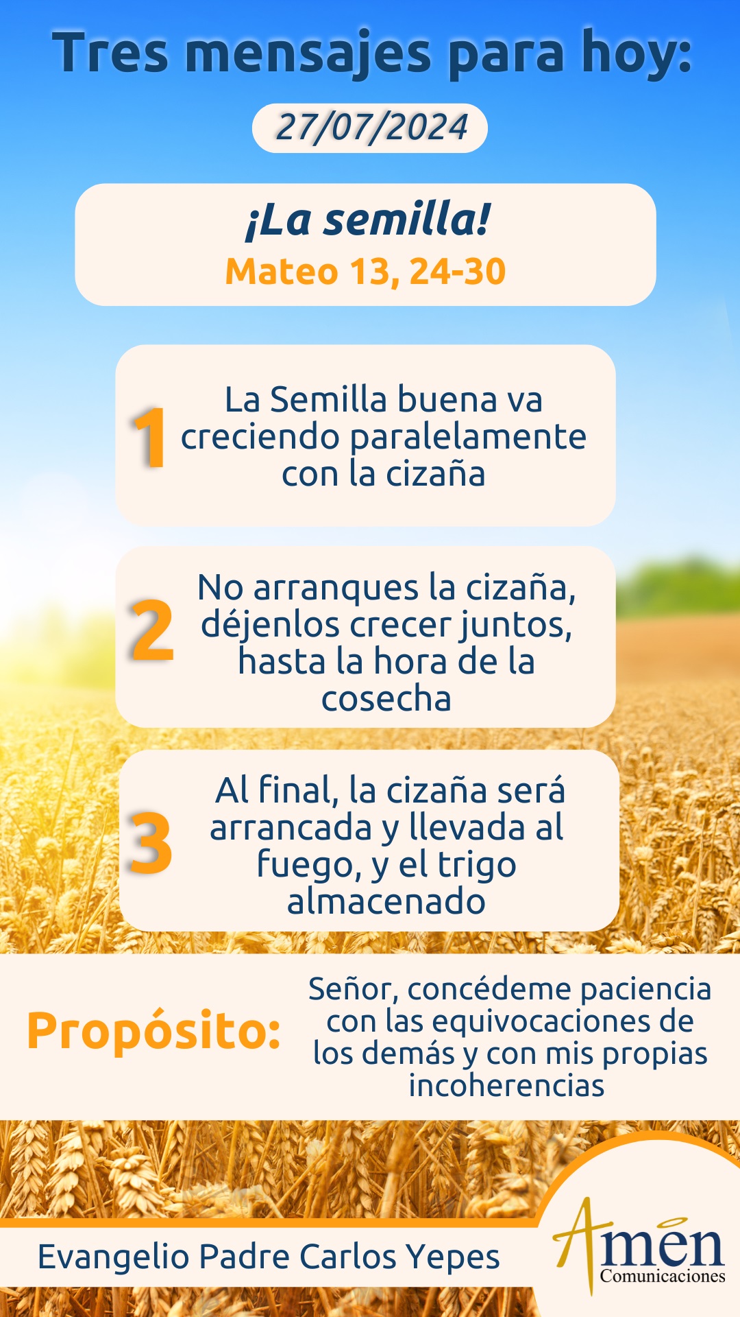 En aquel tiempo, Jesús propuso otra parábola a la gente: «El reino de los cielos se parece a un hombre que sembró buena semilla en su campo; pero, mientras la gente dormía, su enemigo fue y sembró cizaña en medio del trigo y se marchó. Cuando empezaba a verdear y se formaba la espiga apareció también la cizaña. Entonces fueron los criados a decirle al amo: “Señor, ¿no sembraste buena semilla en tu campo? ¿De dónde sale la cizaña?” Él les dijo: “Un enemigo lo ha hecho.” Los criados le preguntaron: “¿Quieres que vayamos a arrancarla?” Pero él les respondió: “No, que, al arrancar la cizaña, podríais arrancar también el trigo. Dejadlos crecer juntos hasta la siega y, cuando llegue la siega, diré a los segadores: ‘Arrancad primero la cizaña y atadla en gavillas para quemarla, y el trigo almacenadlo en mi granero."