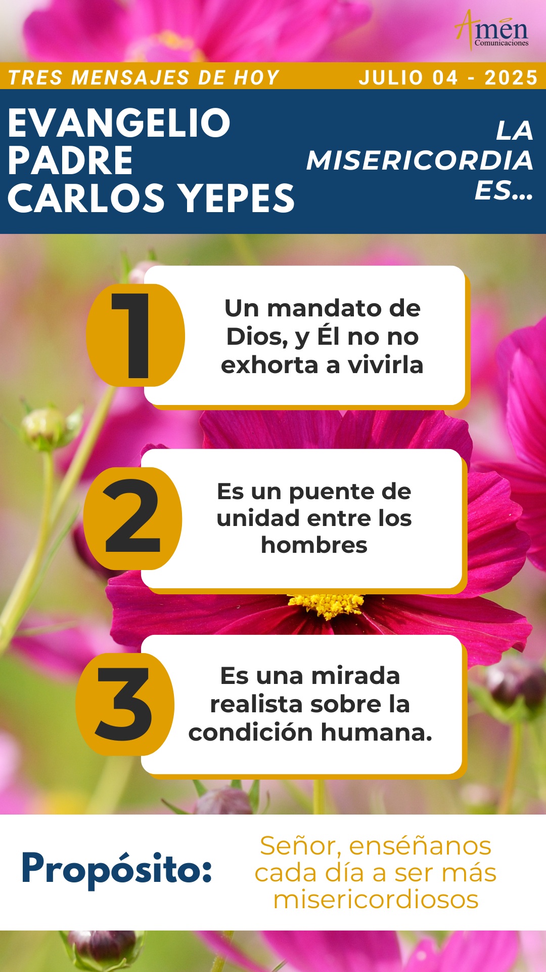 TRANSLITERACIÓN REFLEXIÓN PADRE CARLOS YEPES ¡Misericordia! La primera lectura tomada del Libro del Génesis nos muestra la historia de Abrahán y el final de sus días, cuando su esposa Sara muere después de 127 años de existencia. El duelo natural de Abrahán, que entierra a Sara en el campo de Machpela (frente a Mamre, o sea, en Hebrón, en tierra de Canaán). Más allá de toda esta realidad del duelo por la viudez de Abrahán, nos dice bellamente el texto del Génesis: “El Señor Dios había bendecido a Abrahán en todo”. Pero al mismo tiempo nos habla: “De su hijo Isaac que pasa el duelo por la muerte de su madre, tomando por esposa a Rebeca, quien será la compañera en el camino de su vida de ahora en adelante”. Cuántas veces nosotros hemos visto también en nuestra historia, más allá de momentos de dificultad, de controversia y de prueba, cómo no nos ha faltado la misericordia de Dios. Por eso el bellísimo salmo que la liturgia de este día nos propone, nos invita a cantar: “Den gracias al Señor porque es bueno, porque es eterna su misericordia. ¿Quién podrá contar las hazañas de Dios?, ¿quién podrá pregonar toda su alabanza? Dichosos los que respetan el derecho y practican siempre la justicia. Acuérdate de mí por amor a tu pueblo. Visítame con tu salvación para que vea la dicha de tus escogidos y me alegre con la alegría de tu pueblo, y me gloríe con tu heredad”. Pero pasemos al evangelio de hoy, tomado de san Mateo en el capítulo 9, donde Jesús, precisamente viendo a este cobrador de impuestos en su lugar de trabajo, le invita al seguimiento, y Mateo de manera inmediata lo sigue. Enunciará el evangelio y nos hace presuponer que está en la casa de él, Jesús, sentado a la mesa, nos dirá con muchos publicanos y pecadores que habían acudido allí, a la casa de Mateo. Los fariseos, lejos de alegrarse por la actitud novedosa de Jesús frente a un reconocido pecador o publicano, se escandalizan, se rasgan las vestiduras y se preguntan ¿cómo es posible que Jesús sea rabino, maestro, comiendo con publicanos y pecadores y compartiendo la vida con ellos? Jesús responde de manera tajante: “No tienen necesidad de médico los sanos, sino los enfermos”. Y nos invita a reconocer: “Que lo más importante en la vida no son sacrificios rituales de animales (como se daban en el Antiguo Testamento), sino la misericordia con el necesitado, con el miserable”. Hoy te propongo diez caminos de misericordia para tu vida. El primero, pide a Dios el regalo, la gracia de tener un corazón misericordioso y la mirada de Cristo para apreciar a los demás, más allá de sus debilidades y de sus miserias personales. Es, sobre todo, una gracia divina. En un segundo camino reconocemos, que la misericordia es un proyecto de santidad. De hecho, Jesús lo enunciará: “Bienaventurados, dichosos, felices los misericordiosos, porque ellos alcanzarán la misericordia de Dios”. Hoy puedes buscar tu santificación personal de muchas maneras, pero créeme que, teniendo esa mirada compasiva frente al equivocado, sin juicios, sin rigidez, sin dureza, estás en un camino muy directo al cielo. En una tercera argumentación o camino para alcanzar la misericordia, reconoce que ella es un mandato de Dios y que Dios no nos pide lo que no podamos cumplir. De hecho, dirá Jesús: “Sean misericordiosos como mi Padre del cielo es misericordioso”. Es un imperativo, y Jesús vivió primero su ser misericordioso antes de pedirnos a nosotros ser compasivos con los demás. En una cuarta senda o camino para alcanzar misericordia, reconoce que ella es un puente de unidad entre los hombres. Tantas divisiones en nuestro mundo, tantos conflictos, sólo se superan cuando miramos al otro no como nuestro enemigo, nuestro adversario; sino por el contrario, cuando tenemos misericordia y compasión frente a él, más allá de que piense distinto de como yo pienso y mire la vida de una manera diferente a la mía. En un quinto camino, reconocemos que la misericordia, en definitiva, es una mirada realista sobre la condición humana. Es que todos somos de barro, todos nos equivocamos, todos caemos, y si no tenemos esta claridad y este realismo, nunca seremos verdaderamente compasivos, ni misericordiosos a ejemplo del Padre de los cielos. En un sexto camino, descubre que tu lengua es un sello de seguridad si la usas con misericordia. Aprendamos a callar sobre muchas miserias humanas que descubrimos en los otros y aprendamos primero a mirarnos a nosotros mismos y a decir, ¿quién soy yo para juzgar, si yo mismo he sido un pecador? De hecho, Jesús nos dirá: “No juzguéis y no seréis juzgados, no condenéis y no seréis condenados”. En un séptimo camino, reconoce que la misericordia nos abre a la bendición de Dios. Es que solo recibiremos misericordia del cielo, si somos misericordiosos con los demás, recordando la máxima evangélica proclamada por Jesús: “La medida que uses con los demás, la usarán también contigo”. En un octavo camino reconoce, que sólo el que padece verdaderamente compadece. Y la misericordia nos hace más humanos, más plenamente humanos. Y podría decir, nos hace más divinos, más semejantes al corazón de Dios. En una novena y penúltima afirmación, afirmemos que cuando hay un mayor autoconocimiento de nuestra vida, habrá una verdadera misericordia, porque cuando me conozco en profundidad, en mis equívocos, en mis miserias, no tengo razones para negar misericordia, compasión a los demás. Me gusta repetir esta frase: “El que no se conoce a sí mismo, no puede ser misericordioso con los demás”. Y me gusta también decir: “El que fácilmente juzga de otro, difícilmente se conoce a sí mismo”. Concluyamos con un décimo camino para alcanzar la misericordia, es el camino de la humildad, porque sólo el hombre o la mujer de corazón humilde, mira primero su barro personal, no lo disfraza con la soberbia, la vanidad, y aprende a ser compasivo 