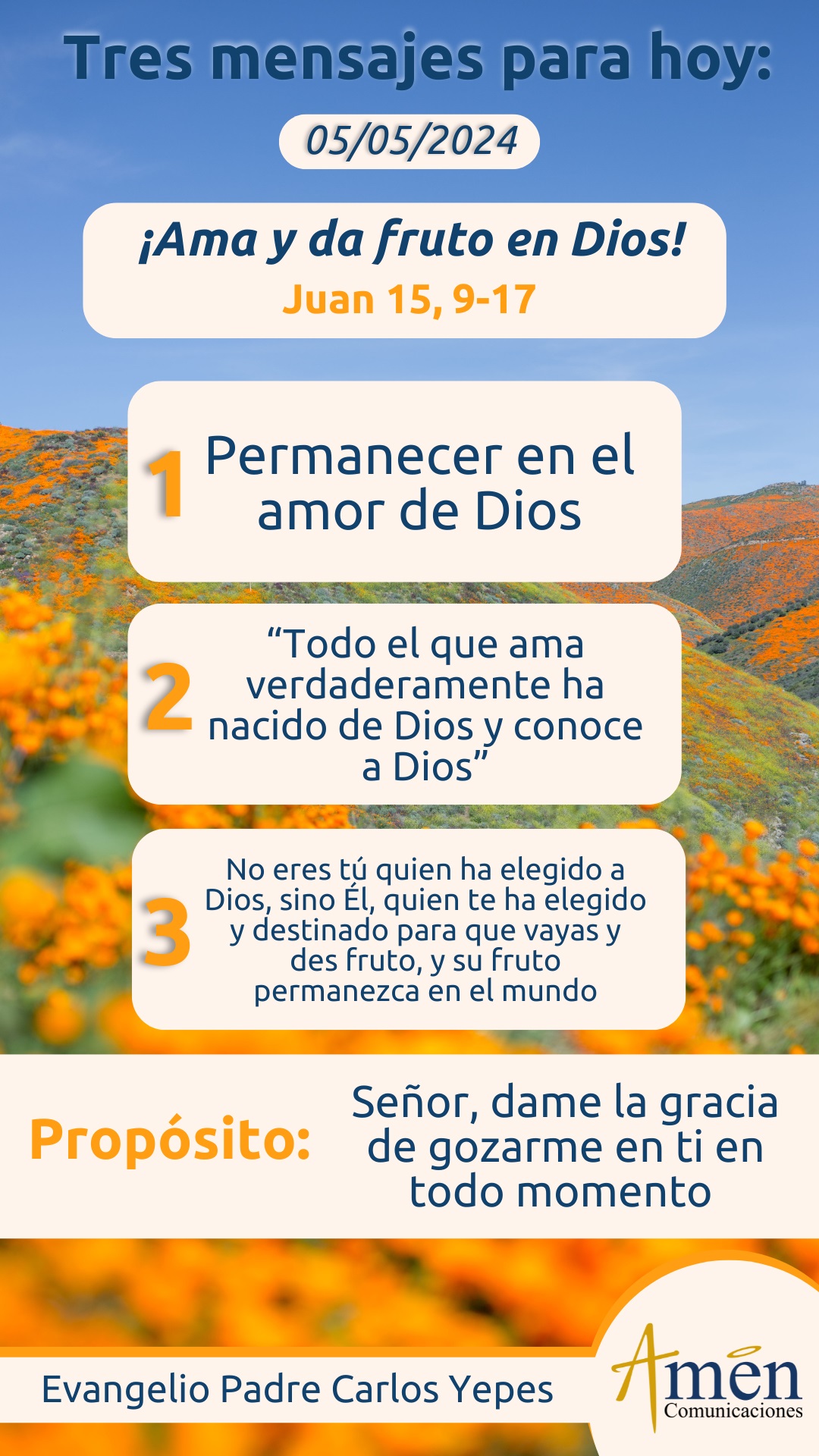 En aquel tiempo, Jesús dijo a sus discípulos: “Como el Padre me ama, así los amo yo. Permanezcan en mi amor. Si cumplen mis mandamientos, permanecen en mi amor; lo mismo que yo cumplo los mandamientos de mi Padre y permanezco en su amor. Les he dicho esto para que mi alegría esté en ustedes y su alegría sea plena. Este es mi mandamiento: que se amen los unos a los otros como yo los he amado. Nadie tiene amor más grande a sus amigos que el que da la vida por ellos. Ustedes son mis amigos, si hacen lo que yo les mando. Ya no los llamo siervos, porque el siervo no sabe lo que hace su amo; a ustedes los llamo amigos, porque les he dado a conocer todo lo que le he oído a mi Padre. No son ustedes los que me han elegido, soy yo quien los ha elegido y los ha destinado para que vayan y den fruto y su fruto permanezca, de modo que el Padre les conceda cuanto le pidan en mi nombre. Esto es lo que les mando: que se amen los unos a los otros”.
