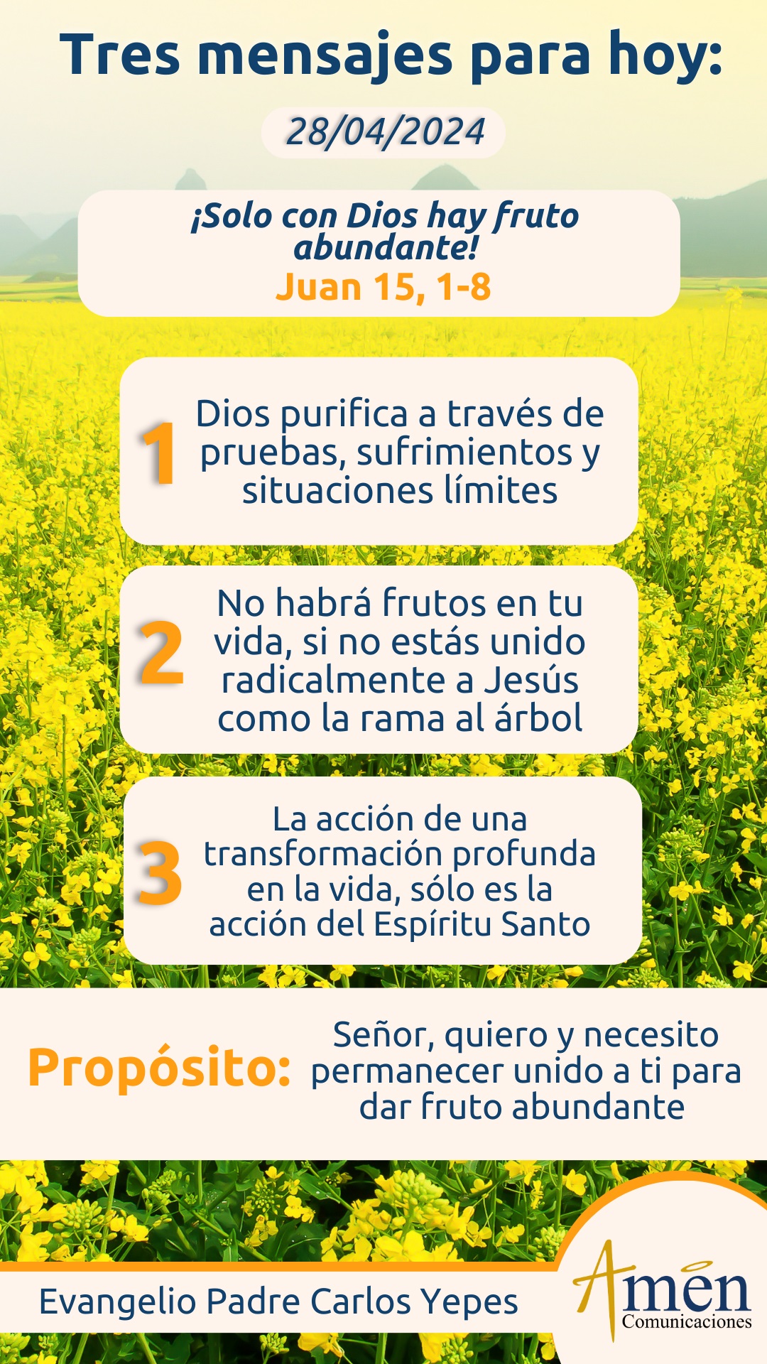 En mis 30 años largos de sacerdocio, para el 31 avanzando en ellos, he aprendido que sin Jesús en mi vida nada puedo hacer, sólo hay esterilidad, solo hay sequedad, solo hay aridez, solo hay frutos humanos que son aparentes, pero no duraderos. La acción de una transformación profunda en la vida, sólo es la acción del Espíritu Santo que se nos comunica, como la savia que pasa del tronco del árbol a la rama y le permite dar el fruto de unas uvas sabrosas, de las que luego se sacará el vino.