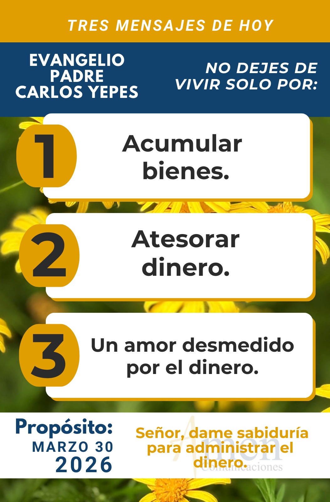 TRANSLITERACIÓN REFLEXIÓN PADRE CARLOS YEPES ¡El diablo entra por el bolsillo! La primera lectura tomada del Libro de Isaías en el capítulo 42, nos presenta el primer cántico del siervo doliente, del siervo sufriente de Yahvé, que anticipa siglos atrás, lo que será la Pasión redentora de Jesús. El profeta Isaías presenta a este Mesías como el elegido de Dios, el lleno del Espíritu Santo, el enviado a llevar el derecho a las naciones, a abrir los ojos de los ciegos y a liberar a los cautivos. Él se describe con el estilo con el que actuará: “La caña cascada no la quebrará, el pábilo vacilante no lo apagará”. Pero a renglón seguido se presenta, “como este Mesías Salvador será luz y redención para la humanidad entera”. Y de manos del salmista como asamblea litúrgica decimos: “El Señor es mi luz y mi salvación, ¿a quién temeré?; el Señor es la defensa de mi vida, ¿quién me hará temblar? Cuando me asaltan los malvados para devorar mi carne, ellos, enemigos y adversarios, tropiezan y caen. Si un ejército acampa contra mí, mi corazón no tiembla; si me declaran la guerra, me siento tranquilo. Espero gozar de la dicha del Señor en el país de la vida”. Y se dice el salmista así mismo: “Espera en el Señor, sé valiente, ten ánimo, espera en el Señor”. Estas lecturas nos preparan para el Evangelio de hoy y de alguna manera, los sucesivos evangelios de martes y miércoles santos, conocidos por algunos escrituristas como los evangelios de Judas Iscariote; porque en los mismos estará como personaje central, la figura de aquel de los discípulos que traicionó a Jesús. Nos habla en efecto el Evangelio de hoy, como seis días antes de la fiesta de Pascua, Jesús estando en Betania donde sus amigos: Lázaro, Marta y María; mientras Marta preparaba los alimentos y servía, María en un gesto de profundo amor, toma una libra de perfume de nardo auténtico y costoso dirá el evangelista Juan y unge a Jesús en sus pies, y luego le seca los pies con su propia cabellera. Judas Iscariote, que según san Juan no sólo era el que manejaba la bolsa de dinero del grupo de los discípulos, sino que era un ladrón que disimulaba hipócritamente que guardaba el dinero para los pobres, pero no le importaban los pobres; se quema, se fastidia y reclama: “¿Por qué no se ha vendido ese perfume de nardo?”, (que podía costar 300 denarios para comprar alimento para los pobres). En el fondo, a Judas no le interesan los pobres, es simplemente un codicioso de dinero. Y esto nos hace recordar tantas expresiones del Papa Francisco, aquí mismo, en nuestra ciudad, Medellín, Colombia, cuando en el año 2017 nos decía: “Cuídense del dinero, que el demonio siempre entra en la vida del hombre por el bolsillo”. Hoy 2000 años después reconocemos que no es la historia sólo de Judas, sino la de tantas personas que han cifrado su vida en acumular, atesorar, y al final su vida se empobreció y dejaron de vivir, por atender aquello que es caduco y que ni siquiera con todo su poder humano, es capaz de dar la total salud, de liberar de la muerte y mucho menos de dar la vida eterna, hablamos del Dios de esta tierra, el dinero, por el cual Judas vendió a Jesús. Pedro, o mejor Jesús, exhorta al discípulo Judas y lo reprende diciéndole: “Deja a esta mujer, el perfume de nardo lo tenía guardado para el día de mi sepultura, y a los pobres los tendrán siempre con ustedes; pero ahora que ha ungido mis pies con este perfume, te recuerdo que a mí no siempre me van a tener”. Concluirá el Evangelio diciendo, que desde aquel día los sumos sacerdotes no sólo habían decidido matar a Jesús porque les resultaba peligroso, sino también a Lázaro, porque muchos judíos sencillos de a pie, por causa de la resurrección de Lázaro, se alejaban del judaísmo y creían en el anuncio y el mensaje de Jesús. Hoy, tú y yo, cuidémonos del dinero, “porque el amor desmedido al dinero (como dirá san Pablo en una carta a Timoteo) es la raíz de todos los males humanos”. Por dinero se vende, se prostituye el cuerpo, por dinero se pelean matrimonios y familias, (la herencia de los papás), por dinero se traicionan amistades, por dinero se venden los principios morales, por dinero se estafa, se trafica con droga, se le quita la vida a otro ser humano. El dinero es el gran Dios en la historia de la humanidad y hoy con mucha fuerza vemos, que quizá sin darnos cuenta, traicionamos a Jesús como Judas, por amor al maldito dinero que repito, ni nos salva de la muerte, ni nos da la vida eterna con Dios. Señor, que el ejemplo de Judas nos sirva para aprender a vivir con más sabiduría en nuestra vida. Que el Señor te bendiga en abundancia en este lunes Santo. En el nombre del Padre, y del Hijo, y del Espíritu Santo. Amén.