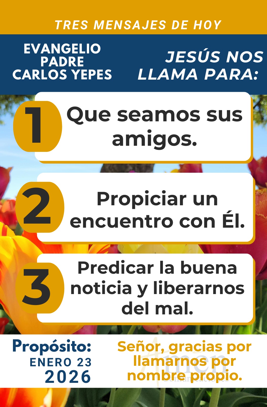 TRANSLITERACIÓN REFLEXIÓN PADRE CARLOS YEPES ¡La vida es un carnaval! La primera lectura tomada del capítulo 24 del primer Libro de Samuel, que nos habla de las dinastías y las monarquías y en general de la realeza en el pueblo de Dios. Nos señala “como Saúl, movido por unos celos rabiosos contra David, (cuando, como hemos leído en pasajes precedentes), el pueblo espontáneamente decía, Saúl, el rey ha matado a 1000 enemigos, David ha acabado con 10.000”. Esto hace que los celos rabiosos que enceguecen al rey Saúl le lleven a perseguir encarnizadamente con un ejército de 3000 hombres al joven David. Reconocemos que los celos no se dan solamente entre semejantes, entre colegas, entre hermanos, entre pares; sino también de un superior jerárquico con un inferior, como el caso del rey, que era superior, contra un inferior, David, que era sólo un simple servidor del rey. Este es el gran retrato de la condición humana, como lo hemos dicho en reflexiones anteriores, y se da en el mundo de la política, en el mundo de la empresa privada, en el mundo del ejército y las fuerzas armadas, aún en el mismo mundo de la Iglesia. Pero pasa en esta primera lectura algo impensable que nos hace imaginar que la vida es un carnaval, una escena inimaginable. El rey Saúl, en su persecución contra David, entra a lo profundo de una cueva para defecar, para hacer sus necesidades fisiológicas y allí, semidesnudo y vulnerable, no sabe que David y el grupo de fieles amigos que le acompañan armados y atrincherados, coinciden en lo profundo de la cueva. Allí están juntos, perseguidor y perseguidos, y empieza una batalla entre el espíritu humano y el Espíritu de Dios. Los amigos de David lo incitan a matar al rey bajo el argumento de que el rey Saúl se ha vuelto su enemigo, de que Dios lo ha puesto a tiro de sus manos. Pero David incitado, motivado por el Espíritu Santo, iluminado por el Espíritu de Dios, afirmará: “No alargaré mi mano contra el ungido del Señor, nunca tocaré al rey que ha sido designado por Dios”. Y simplemente se consoló con cortar un borde del manto del rey, mientras hacía sus necesidades fisiológicas. Y luego encontramos que, en un acto de humildad, de sinceridad y de bondad, en el discurso de David, le habla al rey y le dice: “Que él es un pobre hombre, es un sencillo perro mudo que nunca va a atentar contra el rey, que lo ha tenido a distancia de la espada para matarlo”. Y le muestra cuando ya ha salido de la cueva que pudo hacerlo, pero que él jamás atentará contra la vida del rey Saúl y que no se reconoce como enemigo del rey. Esto quebranta a Saúl, baja sus prevenciones interiores y le dice: “David, hijo mío, el Señor me había puesto en tus manos, y tú has decidido no matarme. Por eso el Señor Dios te recompense por el favor que hoy me has hecho, y te profetizo que habrás de reinar, y serás un gran rey, un rey sabio en Israel”. Con razón el salmo precioso de este día nos invita a recordar ¡Que sólo clamando la misericordia de Dios podemos esperar la protección divina! Y así acabó la mala leche, los celos rabiosos del rey Saúl contra el joven David. Pero pasemos al evangelio de Marcos en el capítulo 3, cuando nos muestra con un claro tinte vocacional, como Jesús llamó a los que Él quiso, a los discípulos más cercanos, a los que les descubre los mensajes más valiosos de su corazón. Reconocemos en este llamamiento de Jesús que la iniciativa divina parte de Él, que busca los discípulos, que los llama por su nombre, que lo hace de una manera discrecional, llamando a los que Él quiere y los llama para hacerlos sus amigos, para compartir su vida y su misión. Llama a los 12 para que estuvieran con Él. Hoy, dos mil años después, Él sigue llamando personas como el grupo de los 12 para seguir siendo anunciadores, evangelizadores con las palabras, con la vida, con la cruz que cargan, con la entrega diaria de la vida nueva del Señor. Hace dos mil años los llamó para predicar y anunciar el Reino y les da autoridad para expulsar demonios, y sintamos que hoy también, 21 siglos después nos sigue llamando a nosotros para estar con Él, formándonos profundamente en el ser y para enviarnos a una misión, el hacer. Es un llamado personal, es un llamado individual. Nos llama por nuestro nombre. Es un llamado inmerecido, no porque seamos mejores, no porque seamos los más pecadores, sino a través de todo lo que somos, nuestras luces y sombras, nuestras virtudes y vicios, nuestras cualidades y defectos. Así nos llama Jesús. Nadie es merecedor realmente y nadie se sienta con más autoridad moral, con más autoridad intelectual para decir yo sí que merezco ser llamado por Jesús. Su mensaje es totalmente gratuito. No depende de méritos, de títulos o de una trayectoria personal, académica, laboral, profesional. A veces llama lo pequeño del mundo, muchas veces lo hace así para escandalizar a los poderosos y sabelotodos de esta tierra. Es un llamado para que seamos sus amigos. Es un llamado para un encuentro de intimidad para compartir la vida con Jesús. Un llamado donde nos envía a predicar y a liberar del mal. Terminaré la reflexión del evangelio pensando en cuáles deben ser las actitudes del evangelizador de hoy cuando somos llamados por Cristo. Y pensaría de manera conclusiva en palabras claves, si tú y yo nos hemos sentido inmerecidamente llamados por Jesús a anunciar su Reino. Primero, agradezcamos. Tengamos una actitud de gratitud por tantas bendiciones recibidas, en tu oración diaria dile, gracias, Señor, por el bautismo que me hizo tu hijo. Gracias por la fe que ilumina mi camino en la vida. Gracias por el amor que me das para compartir con los demás en una sociedad donde hay tanto desamor. Gracias por la familia que me has regalado como coequipera en el viaje de la vida. Gracias por tantos dones y aun por las cruces que presentas en mi vida. Pero, además, el evangelizador de hoy debe tener un cor