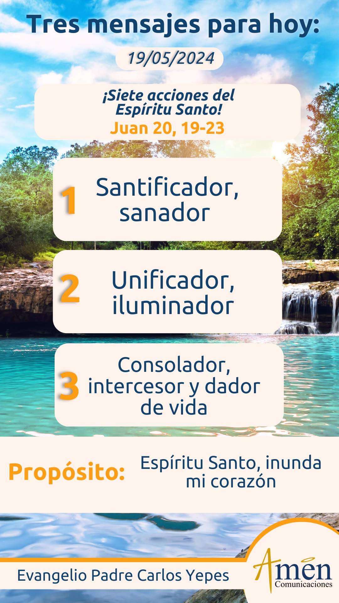 Siete verbos, siete acciones del Espíritu de Dios en este Pentecostés para pedir hoy en tu vida. Él es el Santificador uno, el Sanador, Curador, dos, el Unificador, tres, frente a las divisiones, el Iluminador, cuatro, que enseña y guía el camino de la vida, el consolador, fortalecedor, cinco, que nos ayuda a superar miedos e incertidumbres. Él es el Intercesor, abogado, seis, que ora por nosotros y Él es siete, el Señor y dador de una vida nueva, que sólo conocemos por su acción en nuestro ser, en nuestro interior.