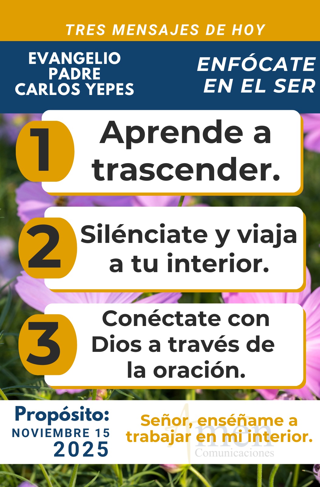 TRANSLITERACIÓN REFLEXIÓN PADRE CARLOS YEPES ¡Entra a lo profundo de tu Ser! La primera lectura tomada del Libro de la Sabiduría en el capítulo 18 y 19, nos recuerda dos hechos fundamentales en la historia del pueblo de Dios. La primera noche pascual en Egipto y el paso por el Mar Rojo. Y nos muestra también la imagen exagerada, hiperbólica del guerrero cósmico, que en el fondo simboliza una realidad que trasciende toda palabra humana y es el poder de Dios. Y expresa magníficamente la realidad consoladora de la providencia de Dios sobre el hombre justo, especialmente en momentos de angustia. De una manera casi poética empieza la lectura del Libro de la Sabiduría en el día de hoy, diciendo: “Cuando un silencio apacible lo envolvía todo y la noche llegaba a la mitad de su carrera, tu Palabra omnipotente se lanzó desde el cielo, desde el trono real, cual guerrero implacable sobre una tierra condenada al exterminio”. En el fondo va mostrando cómo la creación entera es materia moldeable en las manos del artista divino y que todo en el mundo está subordinado a los designios de la voluntad de Dios para cuidar y salvaguardar a sus elegidos. Por eso, en esa misma línea encontramos el precioso salmo de este día que nos invita a recordar “las maravillas que hizo el Señor a lo largo de la historia y también en el espacio del cosmos y del mundo, tal cual como hoy lo conocemos”. Pero pasemos al evangelio de hoy de san Lucas, en una conocida parábola evangélica sobre la oración perseverante que nos habla de un juez que por su identidad y misión está llamado a realizar justicia. Pero lo muestran como un juez malvado, inicuo, que no tiene temor de Dios, ni tampoco le interesa hacerle justicia a nadie, aun cuando es su tarea y misión natural. Y nos presenta la imagen de una mujer viuda, signo por excelencia de la indefensión, la impotencia de los sufrientes de Israel, del pueblo de Dios que clama insistentemente al juez que le haga justicia, que le falle en un proceso probablemente judicial, contra una contraparte, un adversario. El juez para sí mismo se dice “aunque no tengo temor de Dios, ni me interesa hacerle justicia a nadie sólo por la intensidad, por la inoportunidad, por el cansancio que me genera la insistencia de esta mujer, le haré justicia”. Y Jesús concluirá diciendo: “Si esto lo hace un hombre imperfecto, humano, falible; qué no hará Dios el juez bondadoso, cuando tú y yo clamamos a Él con perseverancia, día y noche”. Toda esta imagen parabólica nos invita a la oración perseverante. Pero hoy nos preguntamos ¿cómo orar con perseverancia cuando quiero ir a la Eucaristía, pero me encuentro la Misa en redes sociales y me parece más cómodo, me parece más fácil, aunque no pueda comulgar el Pan de Vida, ni abrazar a mi hermano en la asamblea litúrgica, verla por redes sociales? ¿Cómo orar cuando pongo el rosario en mi teléfono celular y me aparece una publicidad, me aparece otro video con un mensaje sugestivo, atrapante, que me subyuga y me meto a él y pierdo mi tiempo miserablemente? ¿Cuántas personas oigo con más frecuencia de la que quisiera, que me dicen “padre, he perdido una tarde, una mañana, un día entero mirando videos graciosos o supuestamente interesantes o chismes de la vida de los demás en TikTok, en Instagram, cadenas que me mandan de comentarios en el WhatsApp”? Y cómo nuestra vida perdió identidad, perdió relación de intensidad en el matrimonio, con los hijos. Porque nos sentamos a la mesa como verdaderos extraños, sin mirarnos a la cara, atentos solamente a comentar vidas ajenas, guerras ajenas, campañas electorales ajenas, chismes de las famosas y los famosos que son ajenos a nosotros y nos olvidamos de vivir la propia vida. Y van pasando los días, las semanas, los meses de manera miserable perdónenme la expresión, porque viviendo la vida ajena se nos olvida vivir la vida propia. Hoy te invito al silenciamiento tecnológico a tener la capacidad de cortar, por más que te parezca interesante un video, una noticia que te la colocan los portales amarillistas en rojo y amarillo, muy vivos, con títulos muy sugestivos. Lo hay también en la Iglesia unos comerciantes de la fe que han hecho de todo lo católico escándalo que en lo más mínimo les interesa formar o informar a la comunidad creyente, sino solo monetizar a través de carátulas pequeñas que aparecen en tu teléfono celular, en títulos de colores amarillos y rojos muy llamativos. Desconfía, normalmente son embaucadores y comerciantes de la fe que te atrapan y hacen que pierdas el tiempo valioso de tu vida en lo que no es valioso para ti. Silenciémonos tecnológicamente y aprendamos a adentrarnos dentro de nosotros mismos, que es sobre todo una acción del maestro interior, del Espíritu de Dios. Aprende a reconocer que tú no solo eres cuerpo, no solo eres biología, no solo eres materia, no solo eres carbono. Eres también una realidad trascendente, espiritual, que se sale de las coordenadas y de las ofertas comerciales que te aparecen como propaganda cada que abres un video o en el intermedio de cualquier vídeo en redes. Aprende a trascender y a volar. La palabra trascender viene del griego “transcendere”, que significa atravesar subiendo. Conoce lo profundo de tu ser, no te quedes ahogado en el mundo exterior como tantas veces te lo he repetido. Y después de silenciarte y entrar dentro de ti por la acción del Espíritu Divino, empieza a orar en ese Espíritu al Padre de los Cielos por la mediación de Jesucristo. Ora a tu Padre en el silencio de tu habitación, que es el corazón humano. Háblale de tus sueños. Cuéntale de tus miedos. Preséntate con tus heridas. Muéstrate como eres. Pídele identidad, que la identidad del hombre no está en el hacer, sino en el ser. Que nuestra identidad no está en el aparecer ante los demás, sino en el ser interior, el amor divino que le da razón, fuerza y sentido a la vida. Y te inv