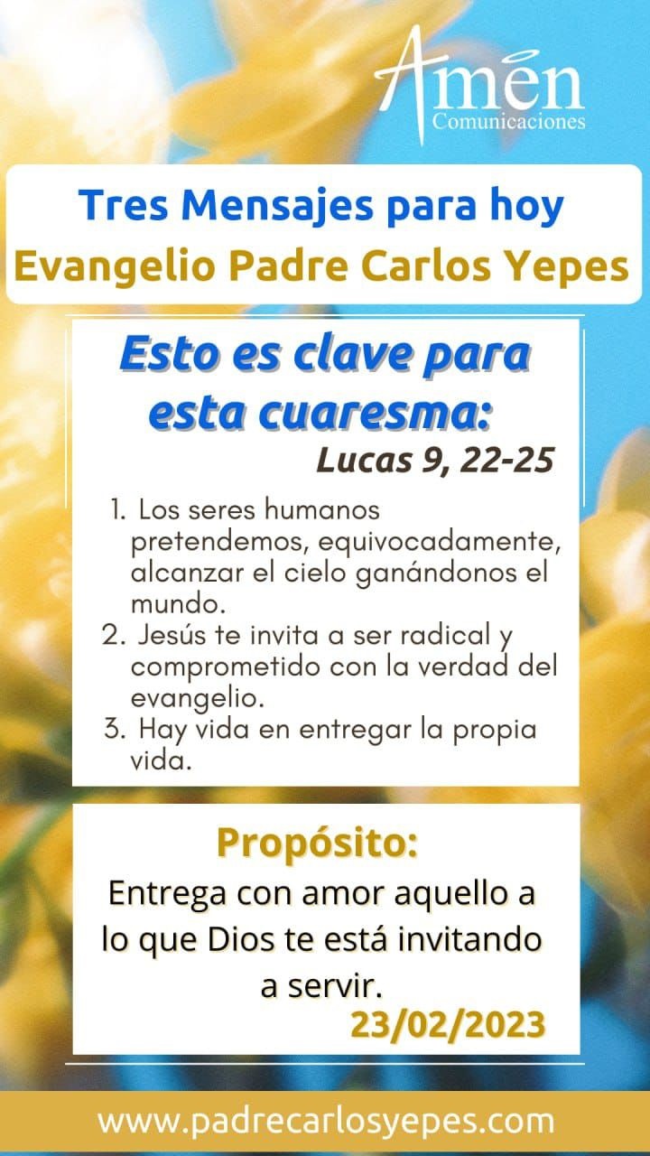 Cuántas personas en la historia del cristianismo, han cambiado su corazón a raíz de esta frase: “quien quiera salvar su vida la perderá, pero el que pierda su vida por mí la salvará”. ¿De qué le sirve al hombre ganar el mundo entero si pierde su alma? Hoy el Señor, en este inicio cuaresmal te habla a ti y a mí y nos invita a cuestionar la vida que llevamos, el mundo nos dice que todo en la existencia es conseguir, acumular, cuidarte, conservarte y pensar muy de soslayo en los demás; el evangelio te dice todo lo contrario: busca al otro, ámalo, sírvelo, entrégate a él, especialmente al que más sufre y que reconoces que está muy cerca de ti, a tu lado; allí está el verdadero camino de cielo, allí está el auténtico sentido para la vida, la vida es grande solo cuando la donamos, la entregamos en servicio alegre a los demás.