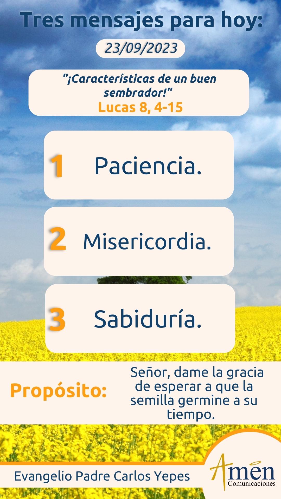 Finalmente concluyamos, hablando de la paciencia, la bondad, la generosidad y la alegría de ese sembrador divino, de ese sembrador de la Palabra que es Dios. Se nos invita a no dejarnos consumir por el ansia cuando no vemos resultados inmediatos en el cambio, en la conversión de otra persona; tengamos la paciencia, la misericordia y la sabiduría del sembrador que es Dios, que siembra semilla en nosotros y espera que germine a su tiempo, y así ocurrirá cuando nosotros sembramos la semilla en el corazón de otros.