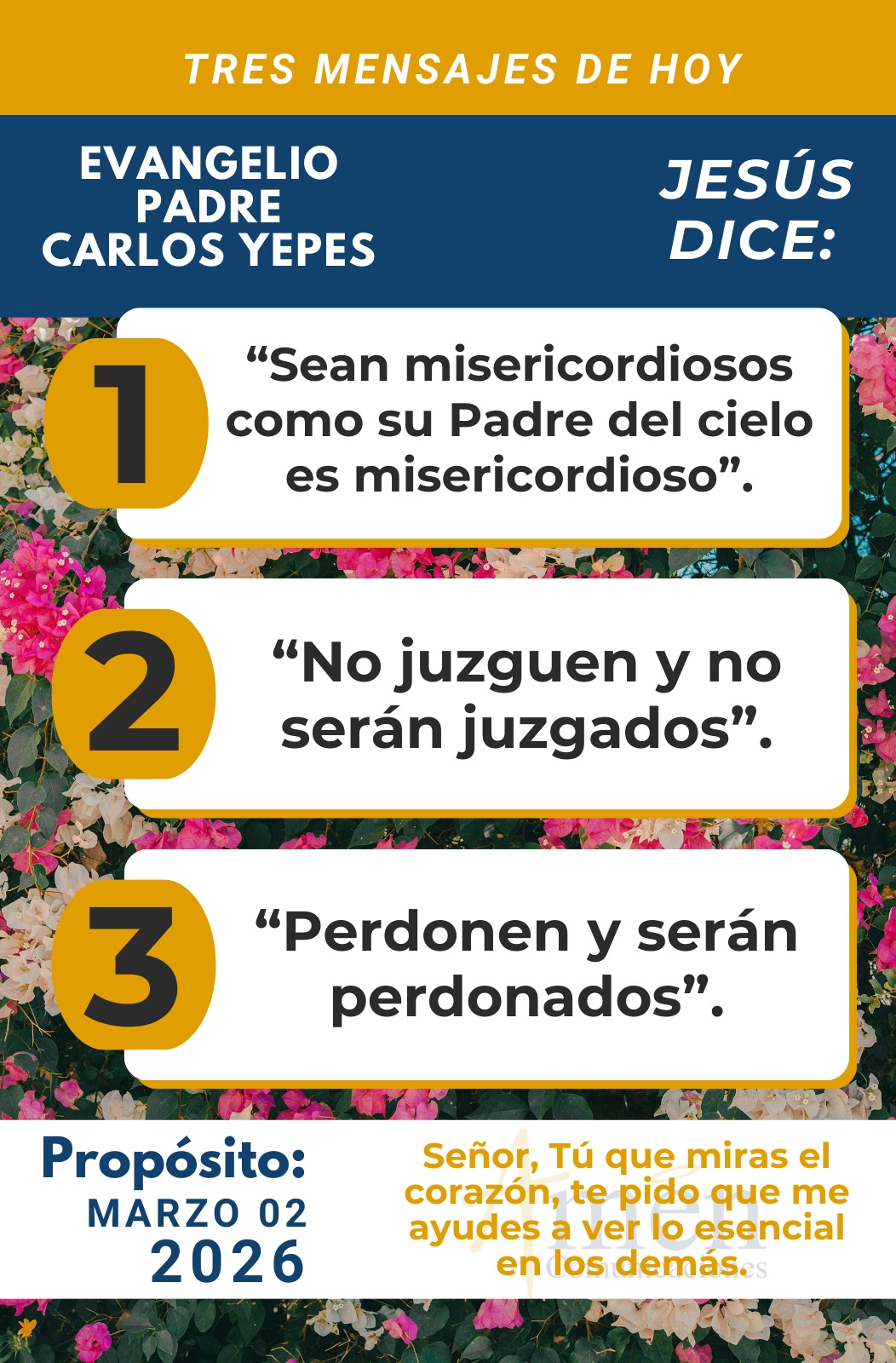 Que el Señor, que es rico en amor y compasión, bendiga tu vida, ilumine tu corazón y te guíe en este día, y te bendigo. En el nombre del Padre y del Hijo y del Espíritu Santo. Amén.