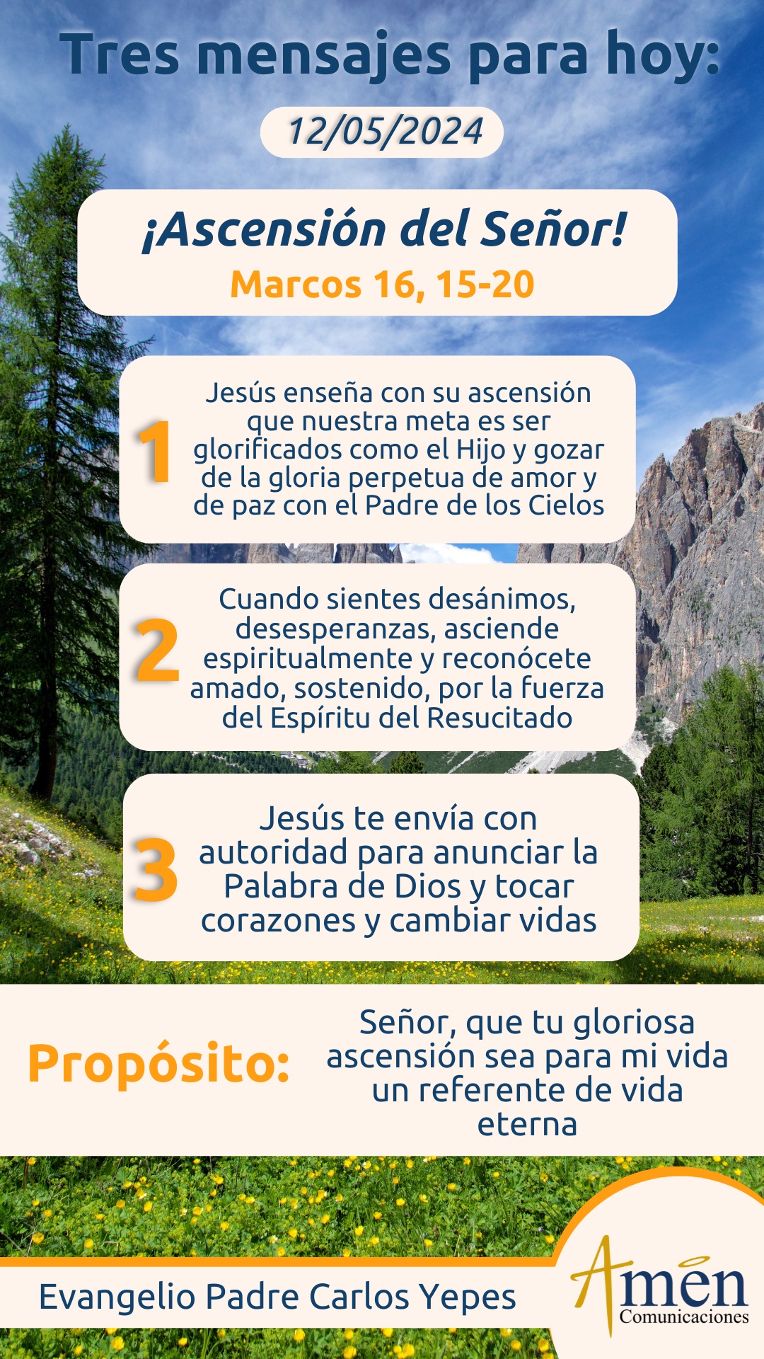 La primera, Cristo resucitado, Cristo glorificado, Cristo el Mesías, asciende al Padre de los cielos y nos muestra a cada uno de nosotros, hoy en esta solemnidad de la Ascensión del Señor al Cielo, que la meta última nuestra, no es quedarnos en un cementerio, en una osamenta, en un cenizario. Nuestra meta es ser glorificados como el Hijo y gozar de la gloria perpetua de amor y de paz con el Padre de los Cielos. ¡Qué misión tan alta!, ¡Qué meta más hermosa!, ¡Qué final más sublime para la vida!, cómo nos llena de esperanza, como eleva nuestro espíritu, como pone un punto muy alto a nuestra misión en el mundo, que no es simplemente nacer, crecer, madurar, reproducirnos, envejecernos, deteriorarnos y morirnos, eso que lo diga el no creyente, el ateo o el pagano. Pero tú y yo que somos creyentes, más allá de nacer, crecer, reproducirnos, madurar, envejecer, más allá de todo esto, no es la muerte el final de la vida, sino el comienzo de la verdadera y plena existencia en comunión de amor y de paz con el buen Dios.