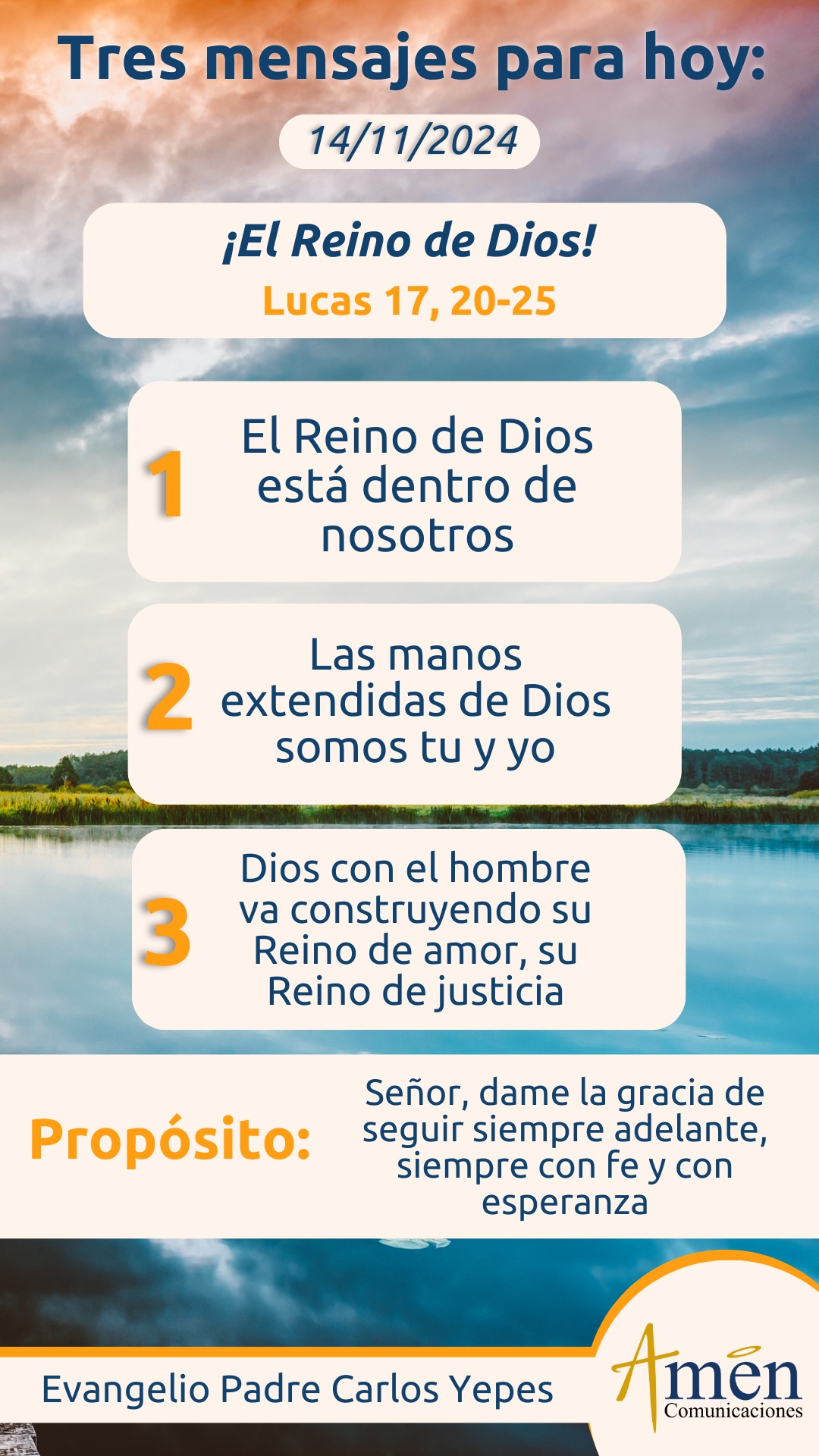 TRANSLITERACIÓN REFLEXIÓN PADRE CARLOS YEPES La primera lectura que hoy nos propone la liturgia de este día de san Pablo a Filemón, nos muestra en un tono muy cercano y cariñoso, cómo Pablo le dice a este querido hermano: “He experimentado gran gozo y consuelo por tu amor, ya que gracias a ti los corazones de los cristianos (él dirá) los santos han encontrado alivio”. Y a renglón seguido afirmará: “Aunque me siento con plena libertad en Cristo para indicarte lo que conviene hacer, prefiero apelar a tu caridad, yo, Pablo, anciano y ahora prisionero por Cristo Jesús”. Qué sentimientos delicados los del apóstol por Filemón, y como confiando en su caridad, más que imponerle alguna orden mandada por el evangelio, confía en la fuerza del amor de Filemón, que le ayudará a hacer el bien. Y continuará en esta primera lectura, recomendando Pablo a Filemón, a Onésimo, a quien siente como un hijo espiritual, a quien ha engendrado en la fe en los días de la prisión que antes era tan inútil para ti y ahora, en cambio, es tan útil para ti y para mí. Y concluirá el apóstol Pablo: “Te lo encomiendo a Onésimo como un hijo espiritual, un hijo muy querido”. Cómo nos tenemos que acompañar los evangelizadores en tiempos en que no somos tantos, cómo nos debemos de apoyar en la oración, en la consejería, en el recíproco ánimo, en sembrar esperanza en los demás, porque el caminar en Dios implica no hacerlo en soledad, si no hacerlo en comunidad, apoyándonos en la fe, la esperanza y el amor unos con otros. Pero pasemos al evangelio de Lucas, capítulo 17, cuando los fariseos le preguntan a Jesús ¿cuándo va a ser la llegada del Reino de Dios?, ¿cuándo va a ser instaurado ese Reino de paz, de justicia, de amor, de vida, de verdad, de libertad que Él viene a anunciar con sus palabras, con sus obras, con sus milagros? Y Jesús les da respuestas que nos ponen a pensar. Primero, el Reino de Dios no vendrá de manera aparatosa, de forma ruidosa, de manera grandilocuente como son las acciones humanas, ni tampoco vendrá de afuera diciendo está aquí o allí, les dirán algunos: “Corran para este lugar o vayan a este otro, pero no olviden que el Reino de los Cielos es como el fulgor del relámpago que brilla de un extremo al otro del cielo, y así será la llegada del Hijo del Hombre, de Jesucristo en su venida final, pero antes tendrá que ser reprobado y rechazado, y padecer por esta generación”. Concluyamos grandes verdades para nuestra vida. La primera, “El Reino de Dios está ya presente y está dentro de nosotros” dirá Jesús a los fariseos que le interrogan, y hoy siente esta verdad, el reinar de Dios actúa en toda la historia humana, en el interior de cada hombre, de cada mujer de buena voluntad que abre su corazón a la paz de Cristo, al amor de Cristo, a la verdad de Cristo, a la libertad de Cristo, al perdón de Cristo. Por eso el Reino de Dios está presente ya actuando en miles, millones de personas, pero lo hace de una manera totalmente silenciosa, sin alardes de poder, por eso no nos podemos dejar embaucar por falsos profetas que anuncian aquí o allí la llegada del reinar de Dios. De hecho, tenemos que decir en una segunda afirmación, cuando Jesús vuelva, nadie necesitará ser avisado, todos lo contemplaremos, no habrá lugar a equivocaciones, porque por sus signos, por señales, descubriremos su acción en medio de nosotros. Hoy siente en tantos hombres y mujeres de buena voluntad, que Dios instaura su reino de amor en el mundo, que las manos extendidas de Dios somos tú y yo, que el corazón palpitante de Cristo somos tú y yo, que la voz profética de Cristo somos tú y yo, cuando en oración, en la verdad de nuestra conciencia, con la fuerza del Espíritu Santo, con una luz nueva y diferente, miramos la realidad de los hombres, la realidad de los valores fundamentales de la vida. Finalmente concluyamos, que Jesús señala: “Que la llegada de su ser, su presencia en medio de los hombres, será precedida por persecuciones, sufrimiento, incomprensiones para Él y para todos sus discípulos, y que ese tiempo el que hoy vivimos y el tiempo de la llegada definitiva de Jesús, es un tiempo para la paciencia en medio de las tribulaciones, para la confianza en Dios”. No nos podemos dejar desanimar, Dios acontece en cada persona y más allá de las pruebas y vicisitudes que podamos vivir Él va realizando su obra en cada uno de nosotros. Más allá de un cambio climático acelerado, más allá de amenazas de guerras que tienden a extenderse peligrosamente a regiones enteras, más allá de amenazas de pandemias y de nuevos virus, más allá de revoluciones disruptivas como la inteligencia artificial y de tecnologías que pueden hacer progresar la humanidad o destruirla, las biotecnologías, las nanotecnologías, tengamos la certeza de que Dios, con el hombre y aun a pesar de los hombres, va construyendo su Reino de amor, su Reino de justicia, su Reino de vida y de verdad en medio del mundo caótico que nos ha tocado vivir. Siempre adelante, siempre con fe y con esperanza, esa es la actitud del verdadero creyente. Que el Señor te bendiga abundantemente en este día, en el nombre del Padre, y del Hijo, y del Espíritu Santo. Amén.